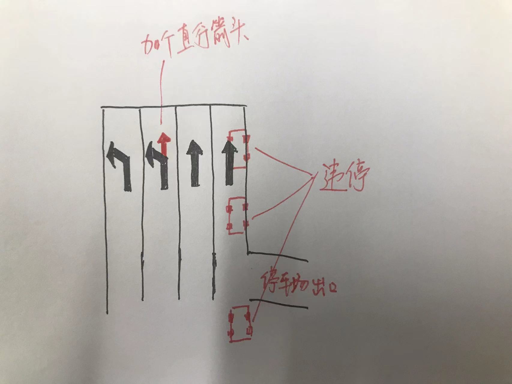 春华路一段与酒城大道四段T型路口的地面标线为2根直行道、2根左转道,最外侧直行道6、7点后长期有车辆违停,影响车辆正常通行(2根直行道实际只有1根正常通行,还要受到停车场出口变道车辆的影响),加之美食街那个停车场出口就在靠近路口,从停车场外出的车辆压实现变道往酒城大道四段的车特别多,造成春华路一段直行车辆直行效率低,是否可以将2根左转道的外侧左转道加个直行箭头,该路口直行车辆大于左转车辆流量。