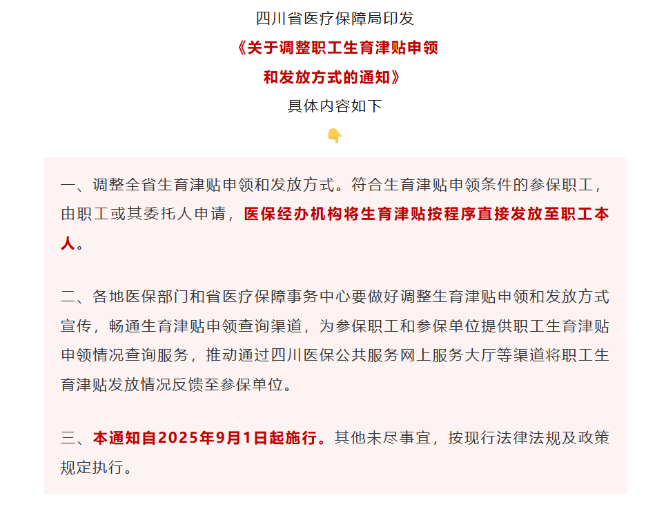 根据政策文件精神,调整职工生育津贴申领和发放方式将于2025年9月1号执行,以申请的日期为准。即2025年9月1号起申请的生育津贴直接拨付到职工本人。