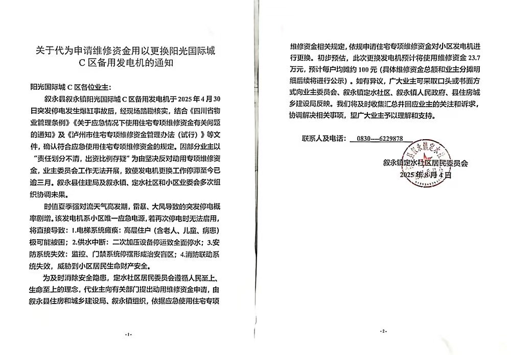 我们期望市、县人民政府秉持“为人民服务、以人为本、为人民办实事”的原则,重视业主诉求,维护社会稳定。恳请相关部门对物业公司违法行为开展调查,同时督促叙永镇人民政府履行《四川省物业管理条例》第七条规定的职责,组织、指导并协助阳光国际城C区召开业主大会,罢免本届业委会,重新选出能切实代表业主意志、履职尽责的新一届业委会,解决电梯安全、公共资金管理、备用发电机等大额资金使用问题,切实维护全体业主对小区公共事务的知情权和生命财产安全等合法权益。