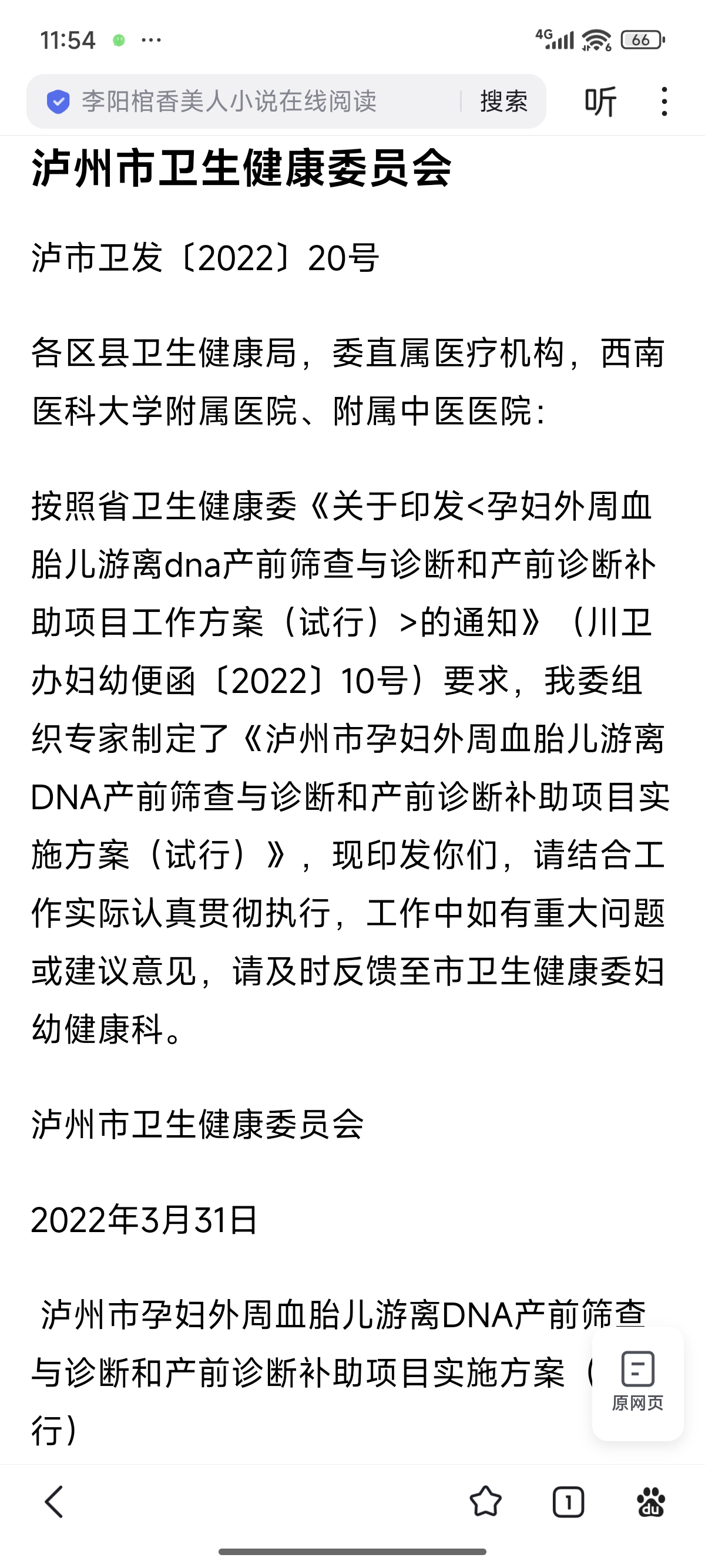 《泸州市孕妇外周血胎儿游离DNA产前筛查与诊断和产前诊断补助项目实施方案(试行)》方案中明确:该项目实施时间自 2022年4月1日起,有效期一年。现该文件已废止。