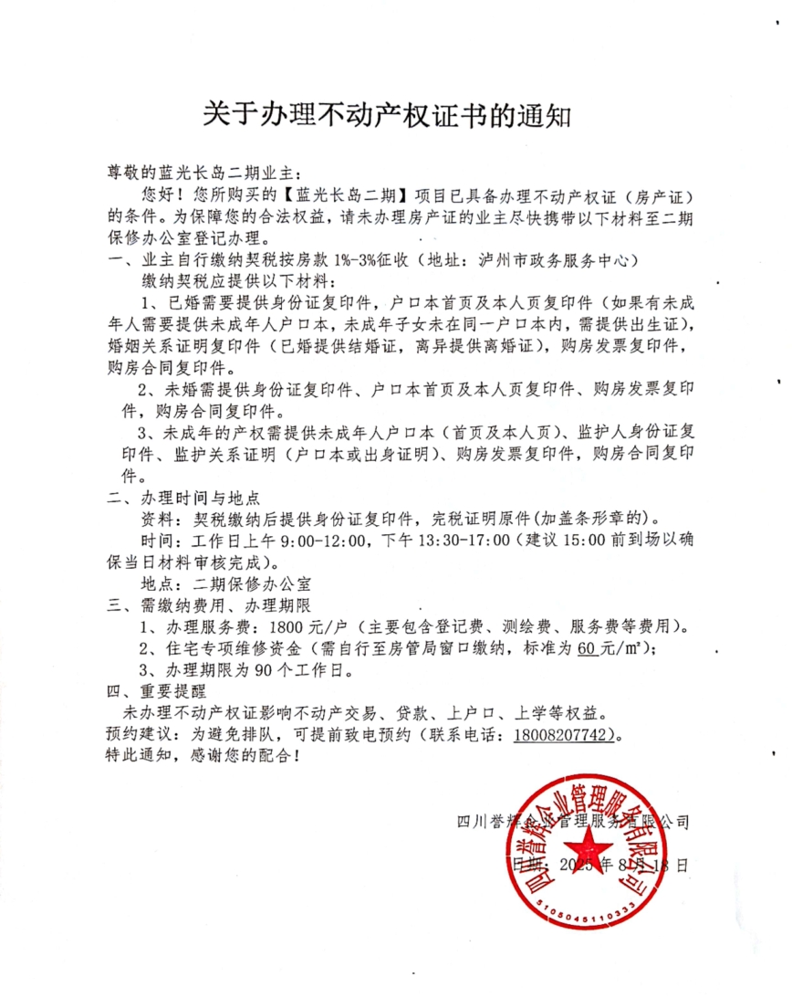 接小区物业部门通知:接地产通知您所购买的【蓝光长岛二期】项目已具备办理不动产权证(房产证)的条件。现由四川誉辉企业管理服务有限公司代为办理,为保障您的合法权益,请未办理房产证的业主尽快携带以下材料至二期保修办公室登记办理。