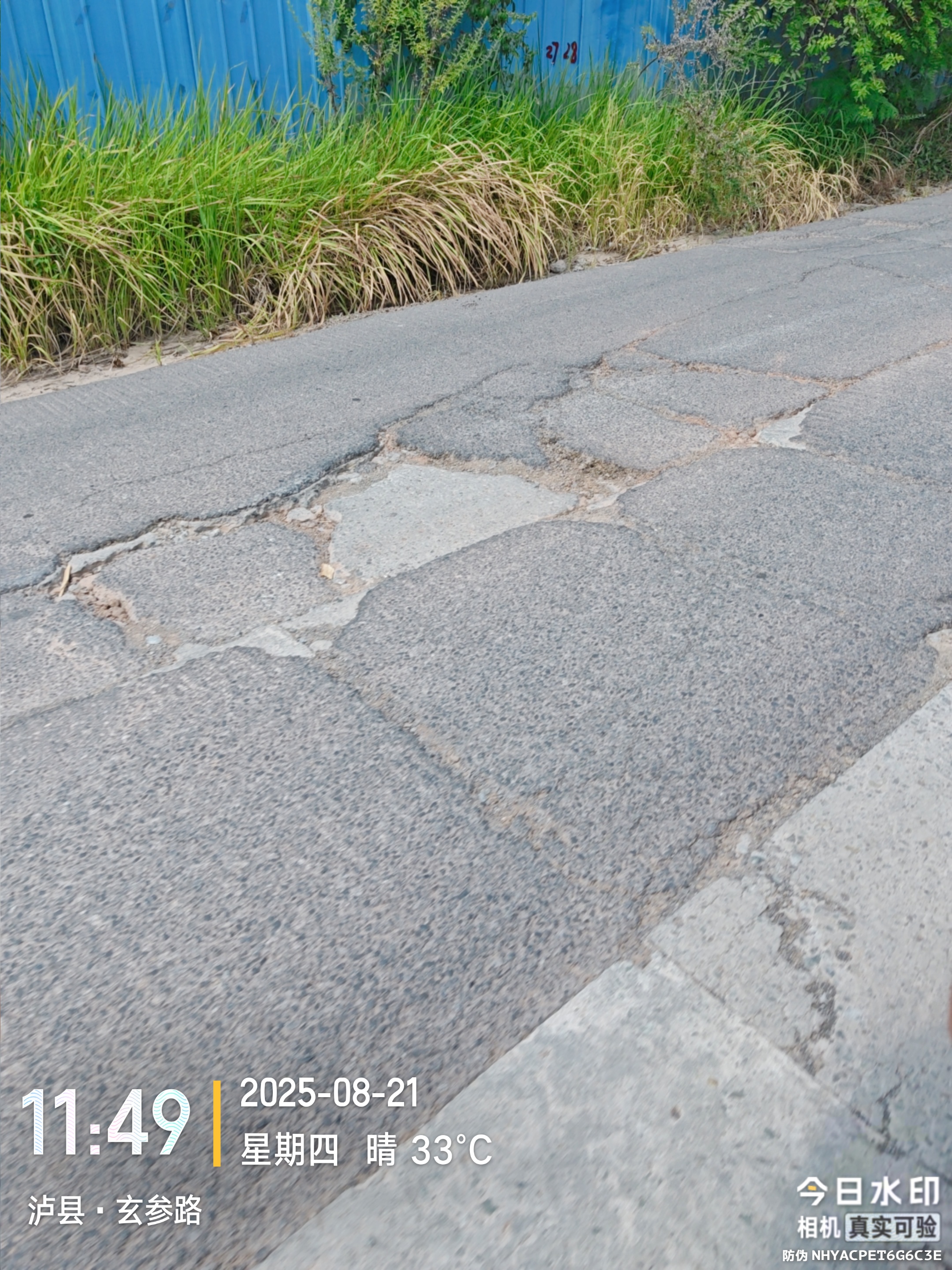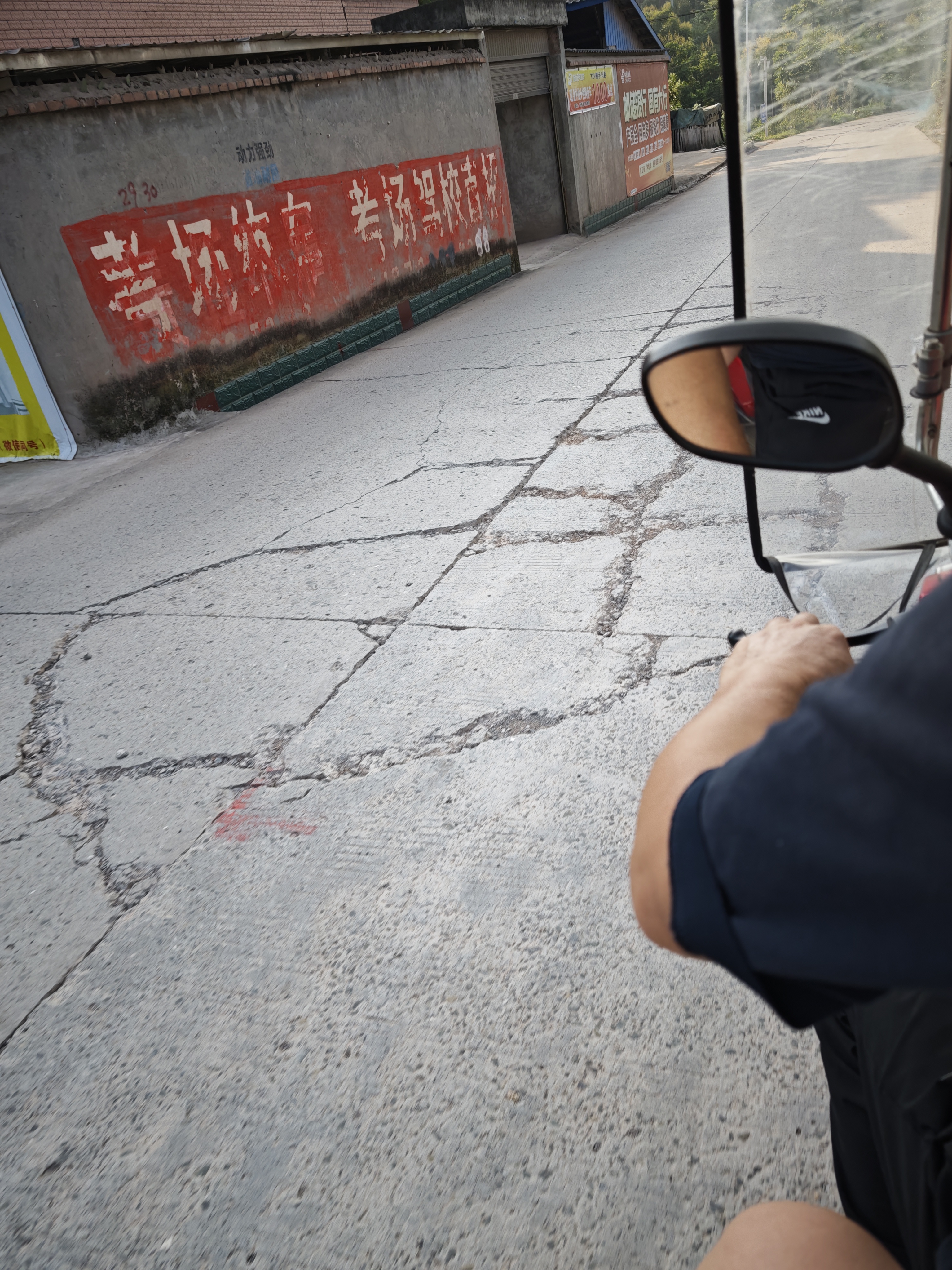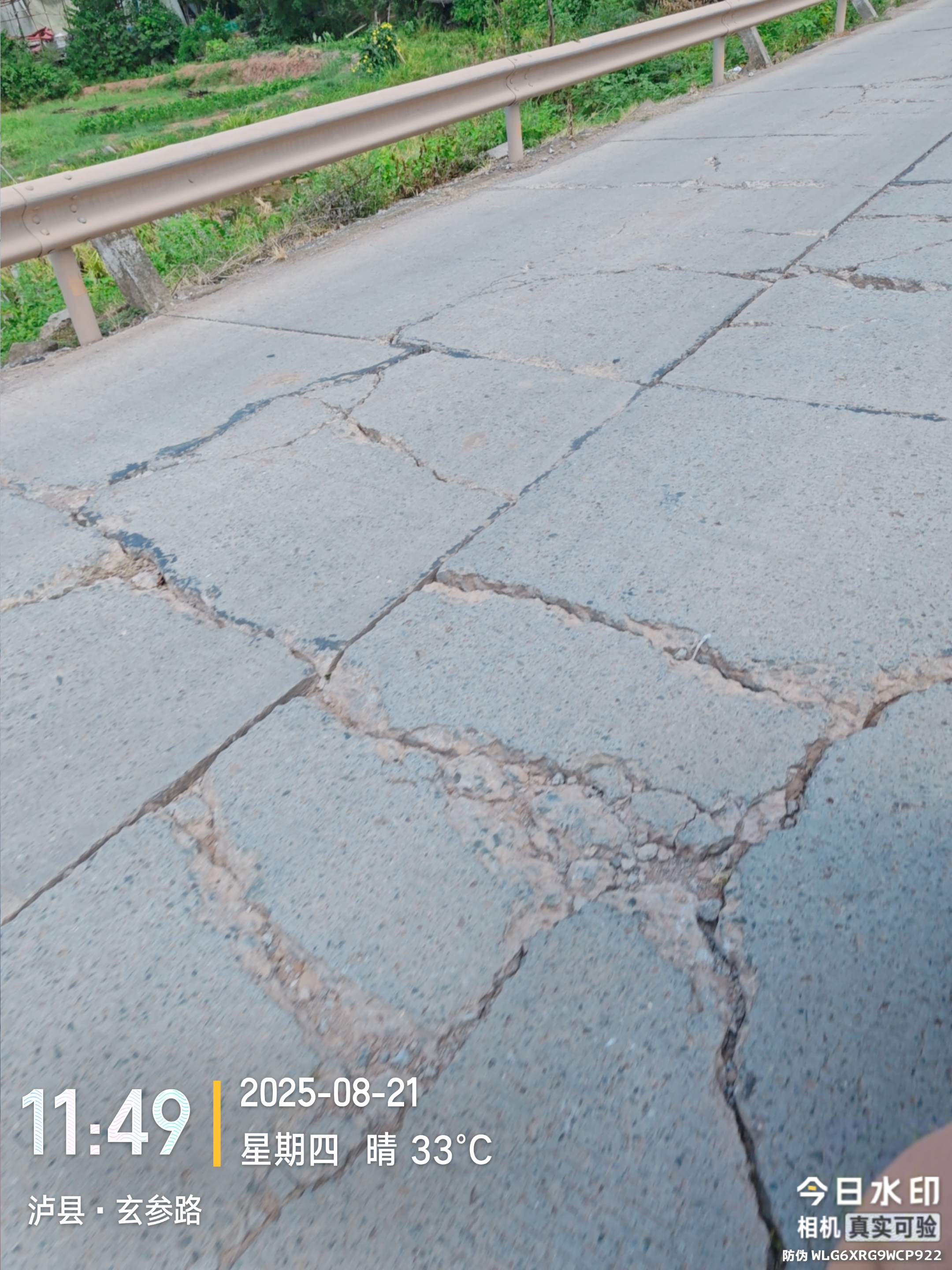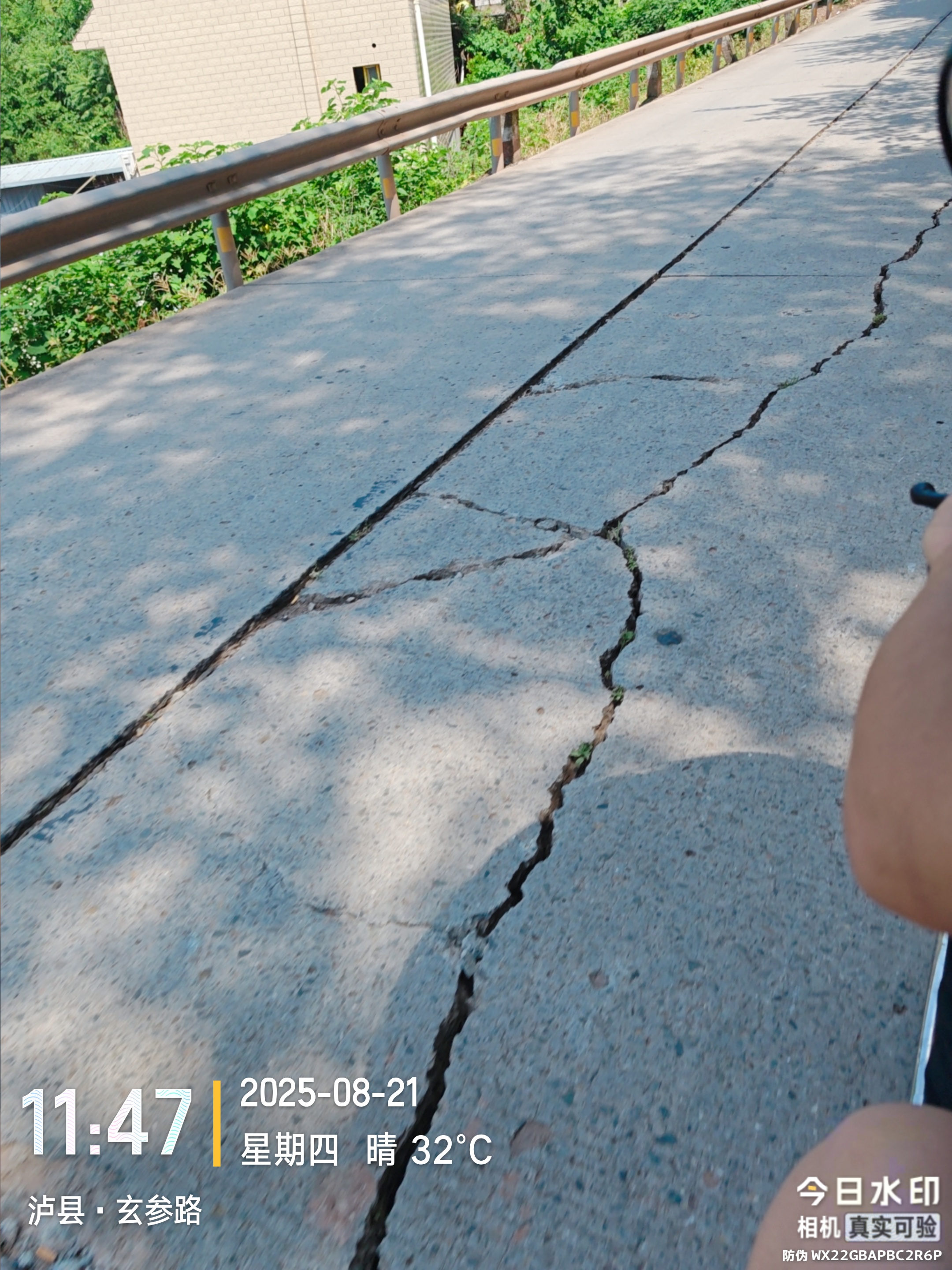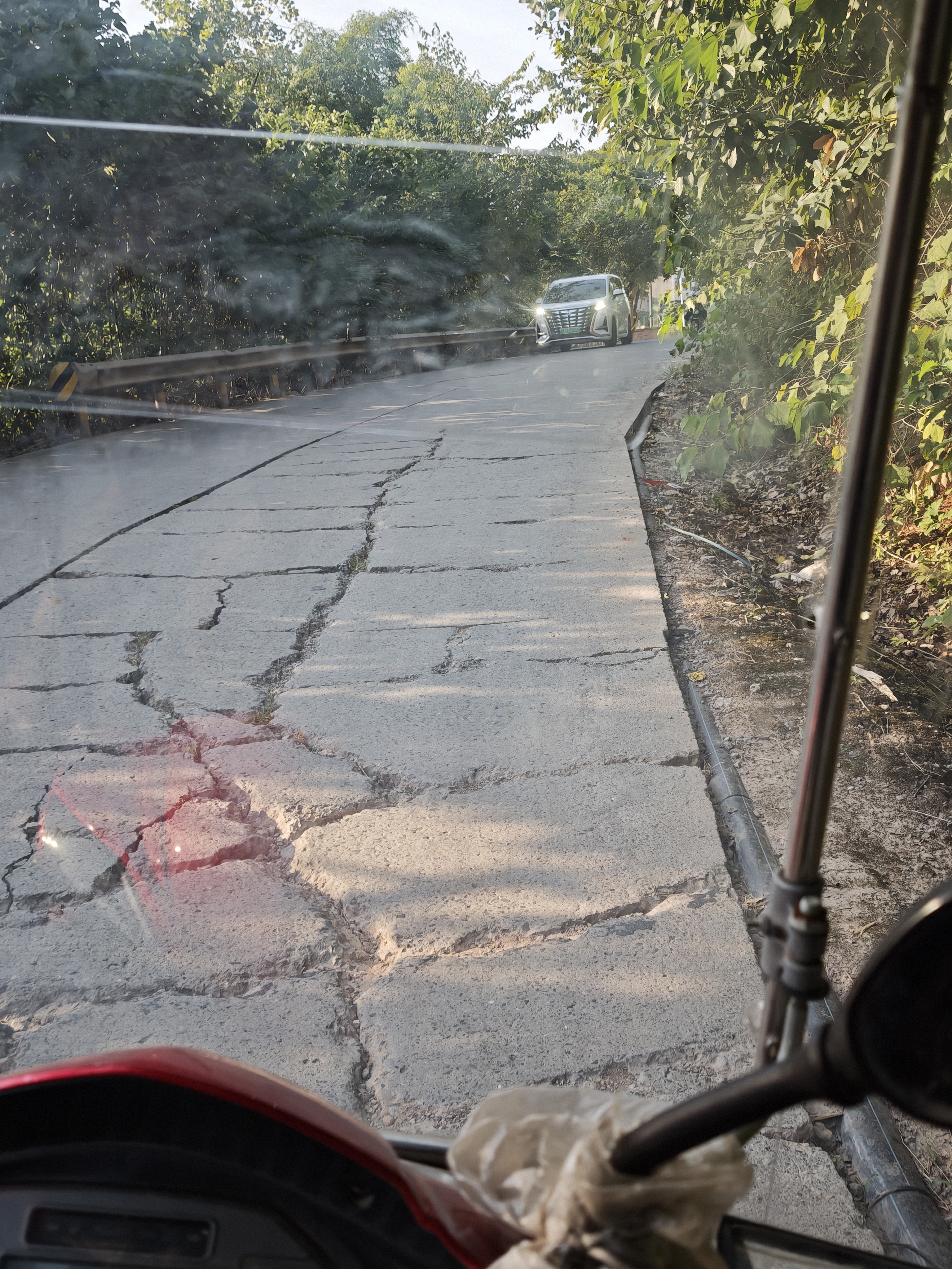 2.裂缝修补不够彻底:路面存在多处宽度较大的裂缝,未得到有效填补。摩托车、三轮车等小型车辆行驶至此时,车轮易被卡住或发生侧滑,风险极大。