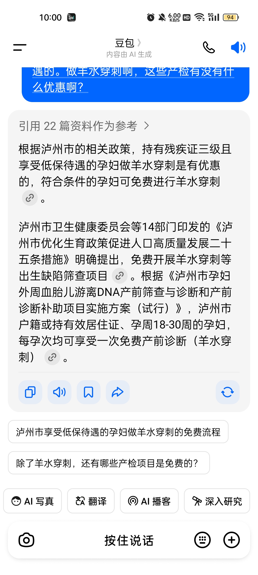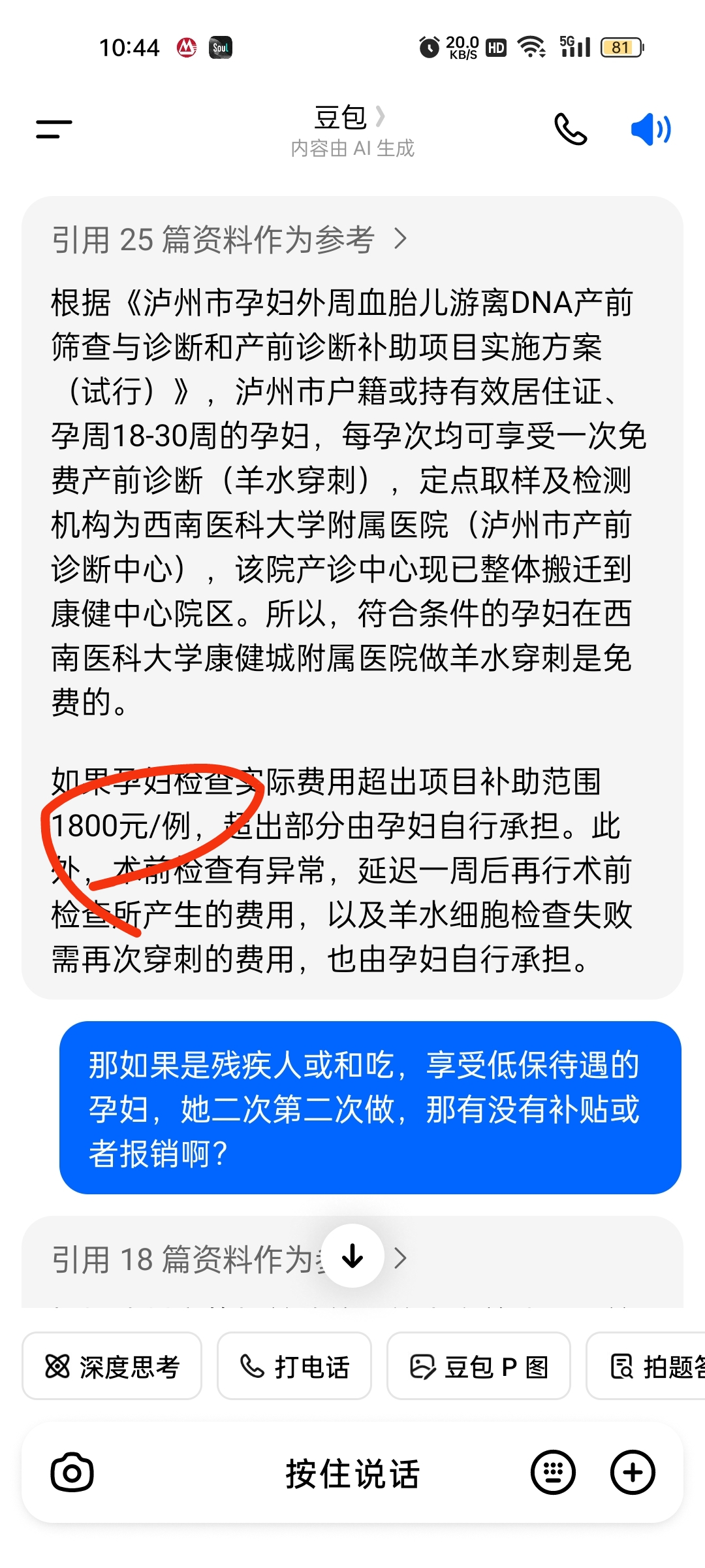我看到泸州有政策说符合要求的孕妇做羊水穿刺第一次是免费的,有1800补助。超过了就该孕妇自己自费。但是我打了医院电话问说没有这个政策。