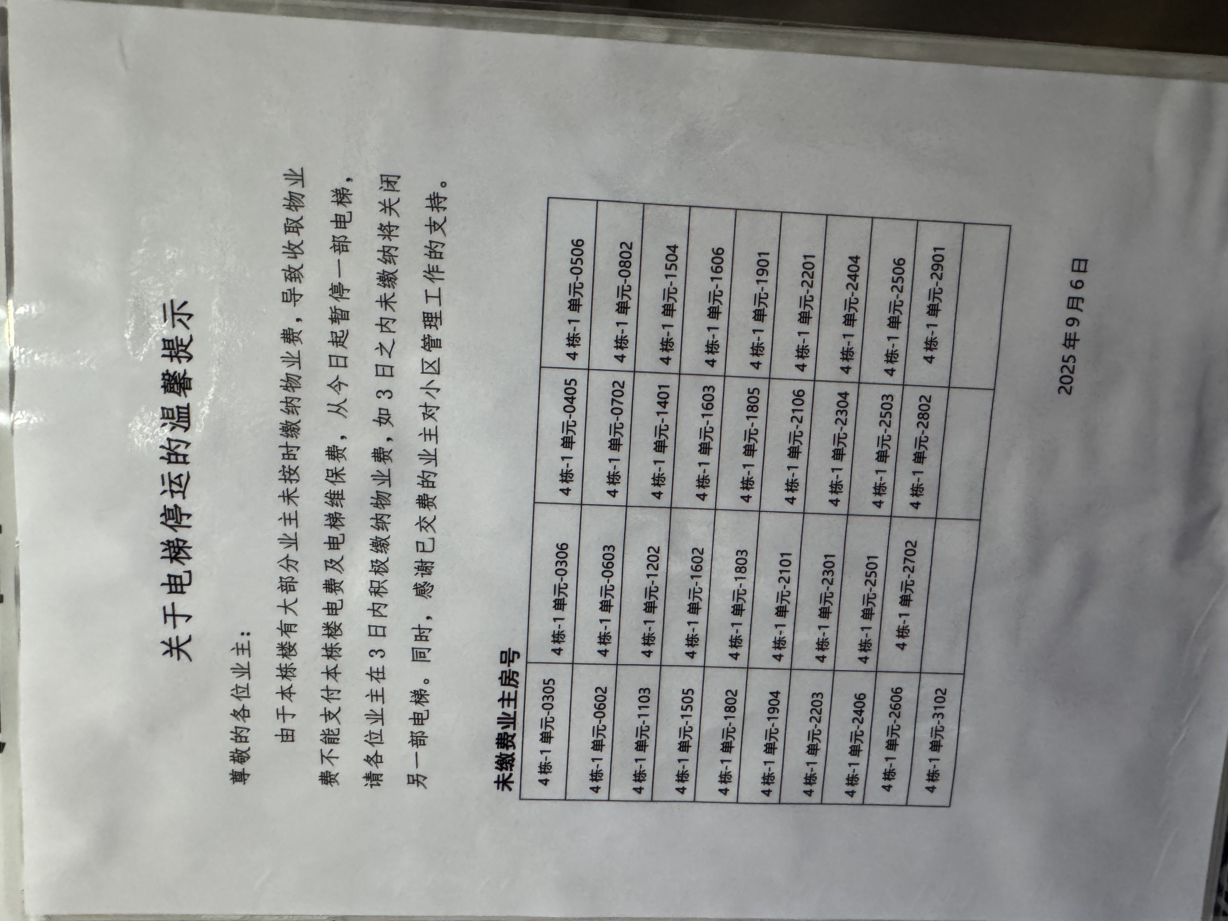 小区每单元配备两部电梯,其中一部自 2025 年 9 月 6 日起被物业公司无故停用。同日,物业公司张贴通知称,若 3 日内欠费业主仍未缴纳物业费,将关停剩余唯一运行的电梯。截至目前,仅存的一部电梯承担整栋楼居民出行需求,导致等待时间大幅延长,高峰时段排队时长超半小时,给业主日常出行造成极大不便。