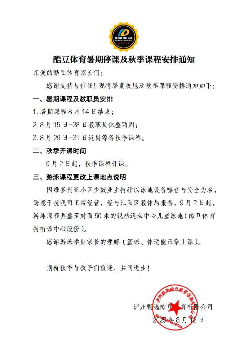 感谢您对江阳教育体育工作的关注与支持,我局将持续跟踪后续进展,切实保障消费者的合法权益,如有疑问可电话咨询江阳区教育体育局:0830-2615282。