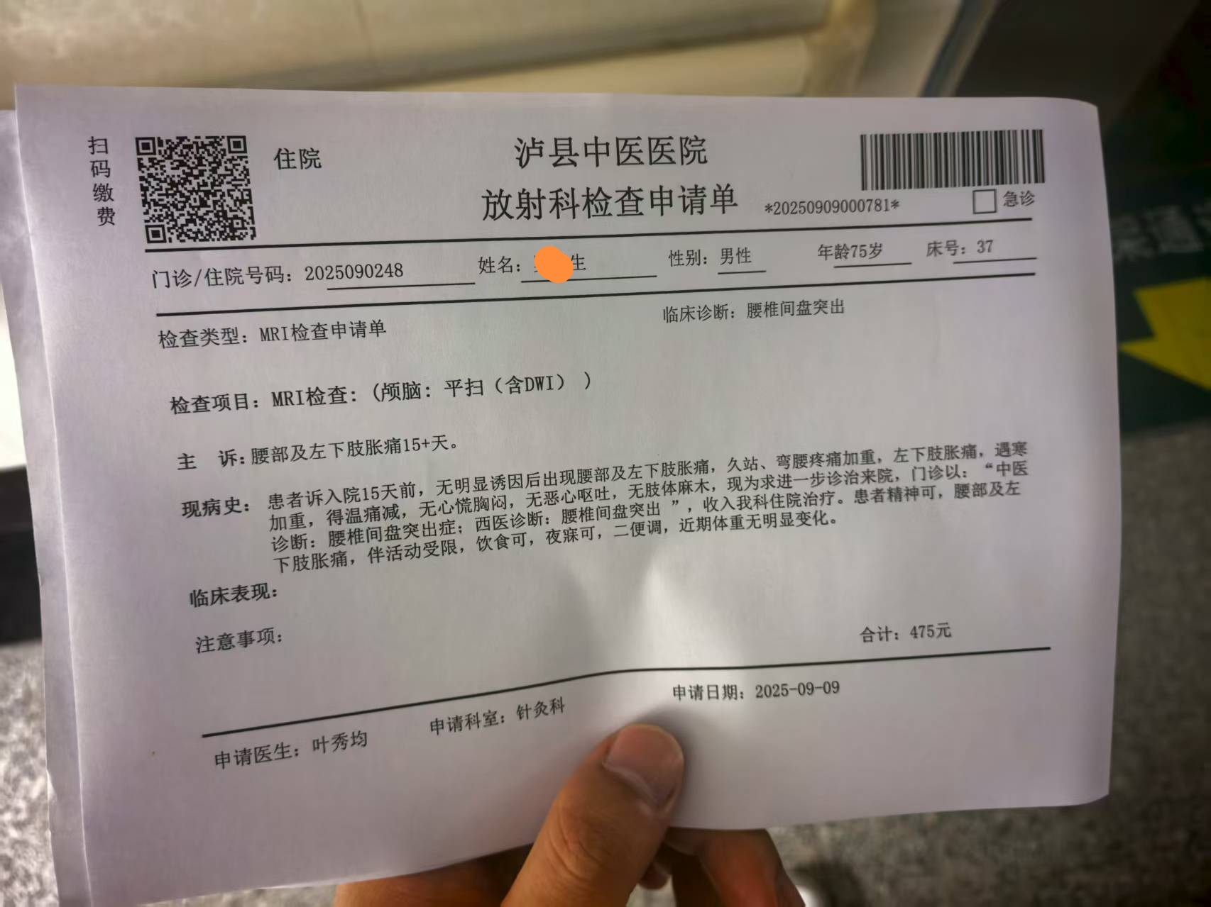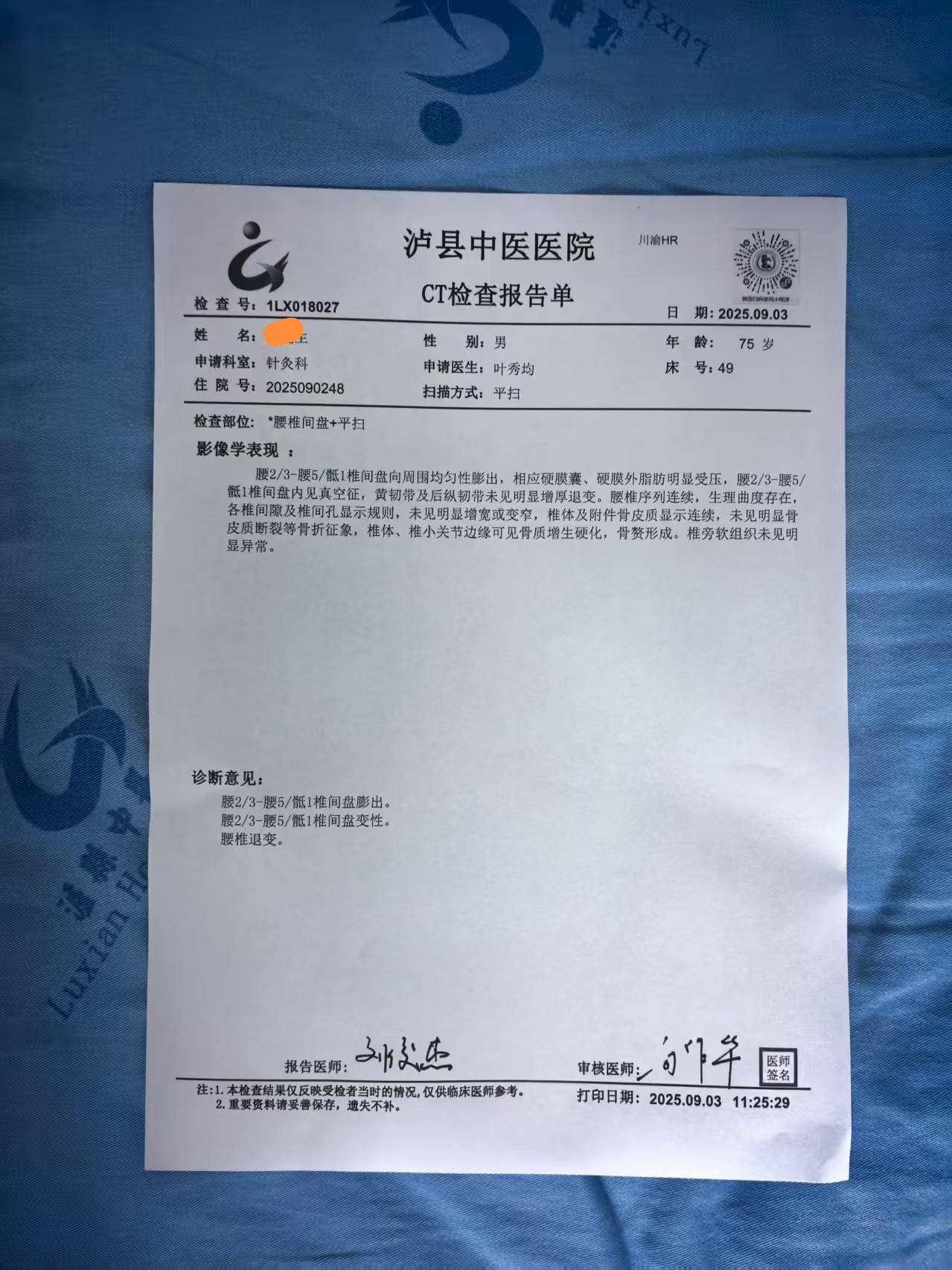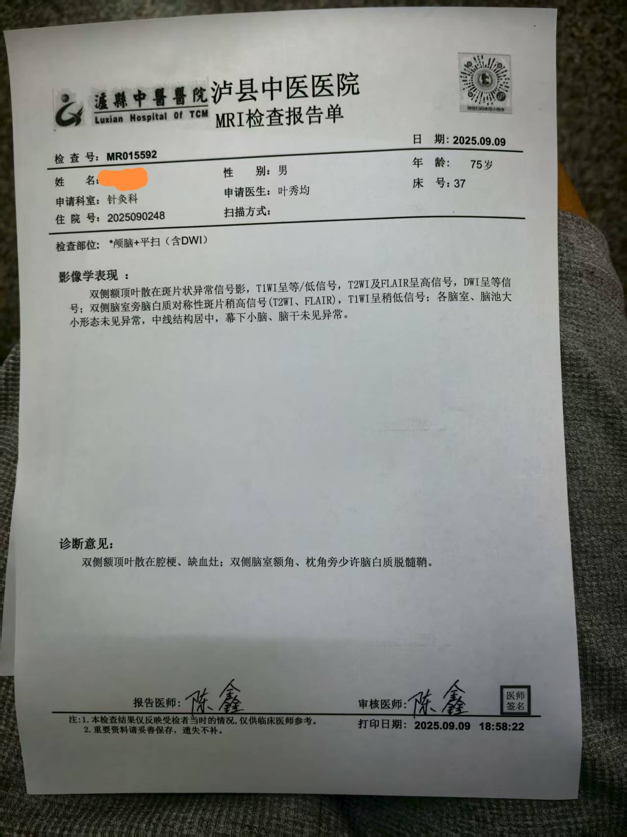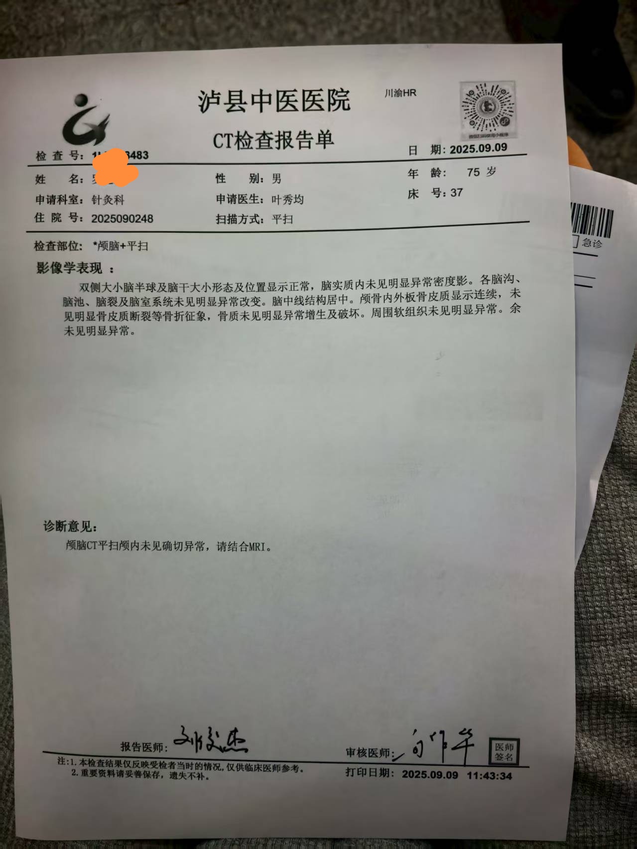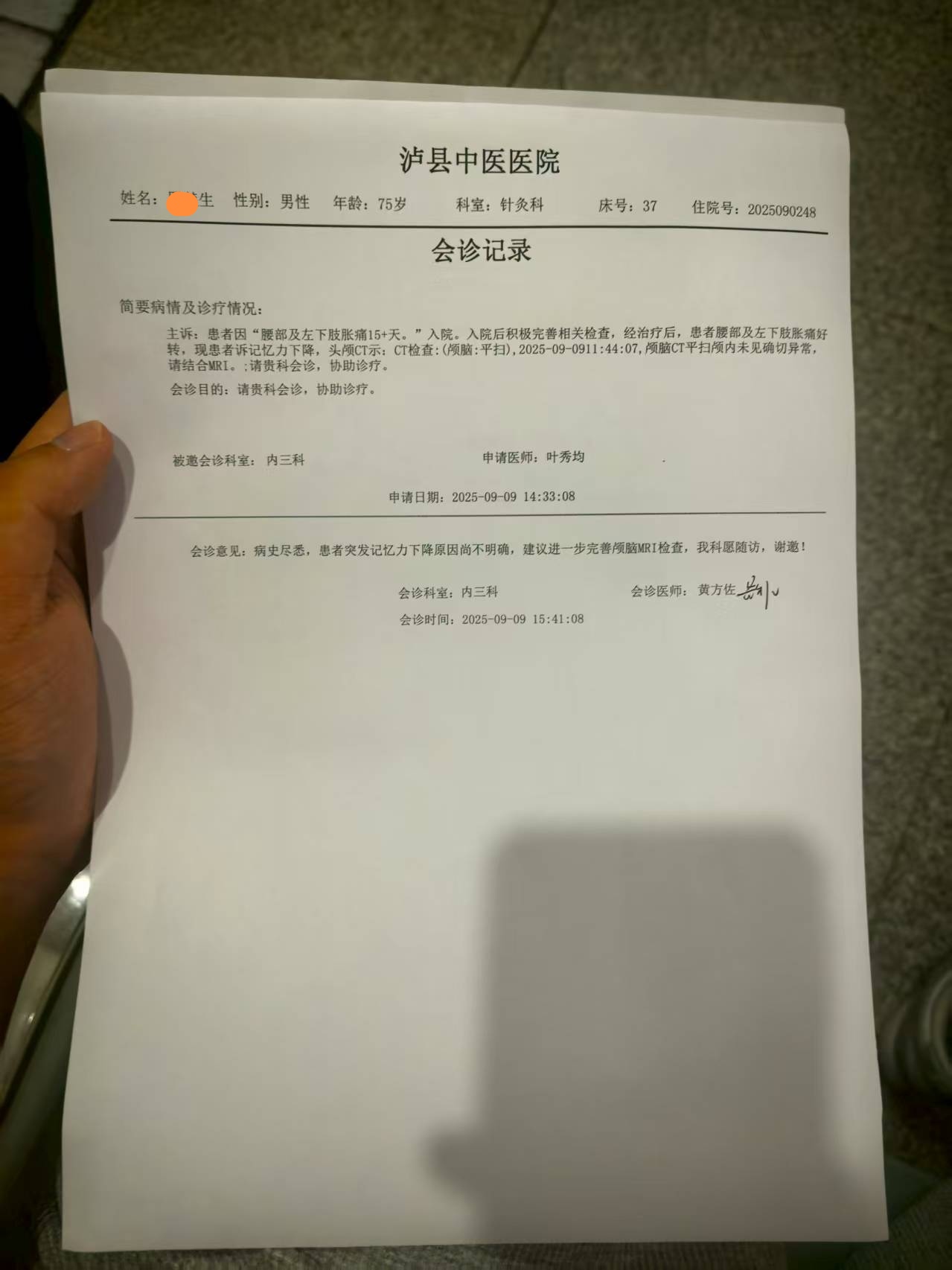 患者罗**现年76岁泸县百和镇人,因感觉小腿肌肉疼痛,脚底板心发热肿胀(没有其它不良症状精神状态很好,记忆力也很好,家里家外的事情都是他在家操心)。于9月2号单独一个人骑电动三轮车到泸县云锦中医院针灸科治疗;拍片后医生诊断是腰间盘突出,第一天针灸治疗感觉很痛,扎得太深了老人家实在忍受不住,还叫医师快点拔出来,医师治疗时嘻嘻哈哈一点都不顾病人的感受,针灸治疗结束后问医生可以回家住不?医生说可以,然后就骑三轮车回家了,回家后就感觉不对劲,有点儿记不住事情;第二天早上还是骑三轮车去医院就诊,治疗时也很痛苦,结束后出来就记不住自己的三轮车放在哪里了,来回找了很久才找到,回到家除了针灸部位疼痛还感觉记性越来越差了,以前自己经历的事情都想不起来了;第三天他就说不骑车上去了,怕记不住停在哪里出来找不到,第四天第五天都没有骑车去,到医院都找不到方向了,在几楼治疗也忘了,在几号床也想不起来了,都是问护士才找到的,治疗回家感觉记忆力极具减退,第五天治疗后从医院回来发现钱包没有了,找了很久自己都慌了,我安慰他好好想想,他说记不起来放哪里了,后来才在风波里面找到,他也记不住回来啥时候放的,刚吃完饭过几分钟问他吃的什么东西都想不起来了,家里修了房子也想不起来了,房子前面的公路修没修都不记得了…但有些事情他还是记得住,比如儿女媳妇孙子的名字他记得,生产队的好多人和事也想得起来,好端端的一个退伍老军人,因得了腰椎间盘突出被医院医生治疗成这样子,现在就是坐着呆呆的没有精神记忆力极具下降,好多自己亲身经历的事情都记不起来了,间隙性失去记忆了,生活也不能自理了。造成这种严重的医疗事故,泸县云锦中医院医生在治疗过程中肯定是有严重失误和重大责任的,要求医院做出合理的解释,采取最有效的补救措施来解除患者的痛苦。