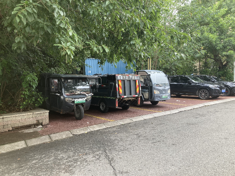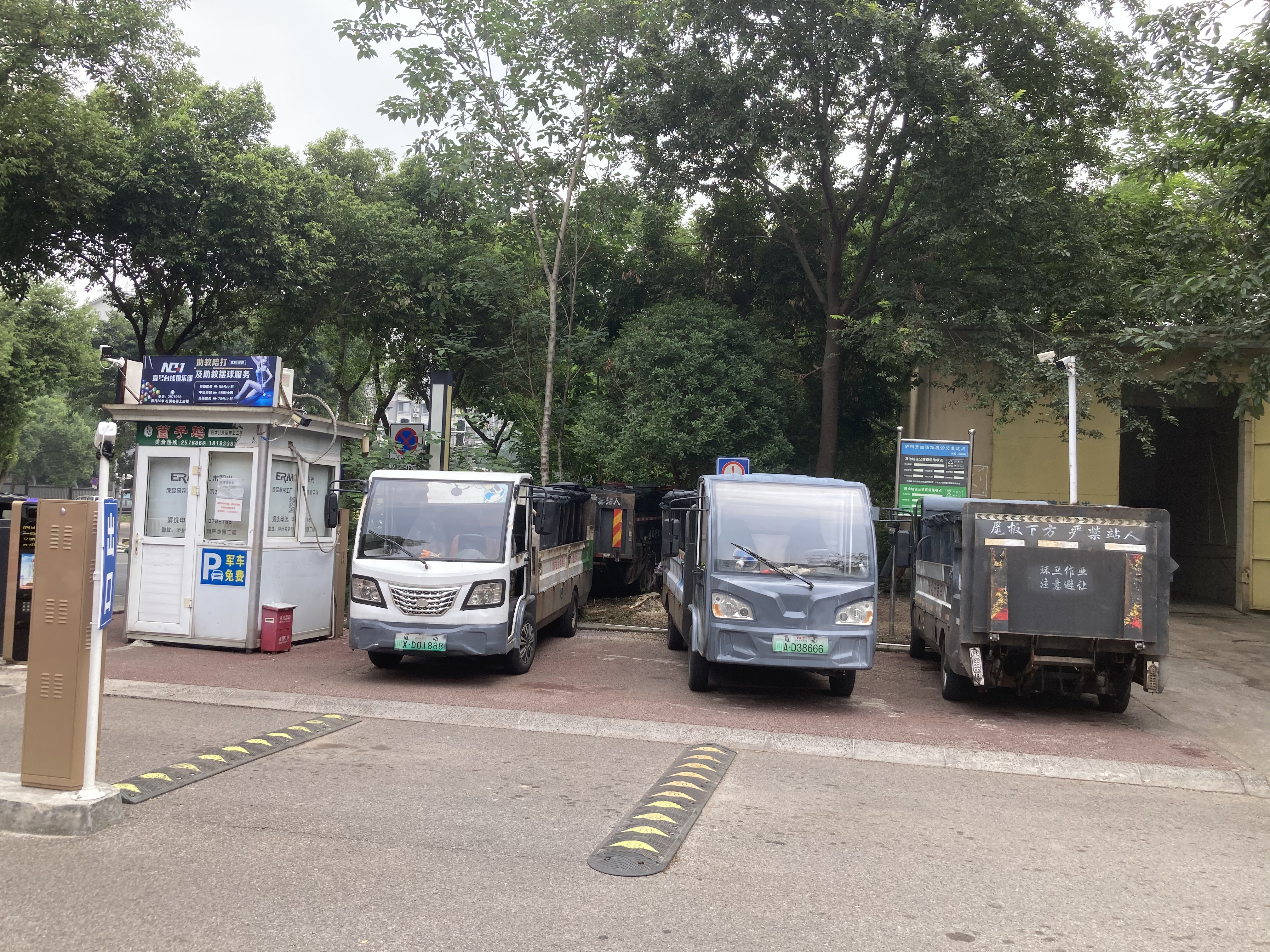 更令人担忧的是,垃圾转运车车体较长,突出至车道,作业时进一步占用道路,导致行人无法正常使用停车场内的人行道,被迫绕行至小区出入口的行车道,存在显著的交通安全隐患。