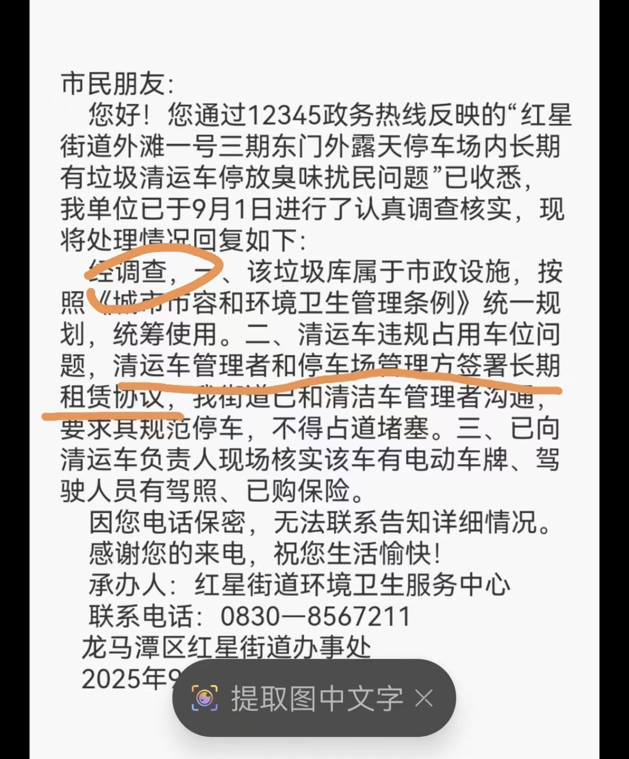 业主听信物业解释将该情况反应到12345市政热线和巡视巡查组,得到红星街道办回复,垃圾转运公司是租赁的停车位,也就是说物业不但不理会业主诉求,反而找各种理由推诿甚至不惜诬蔑政府有关主管部门。