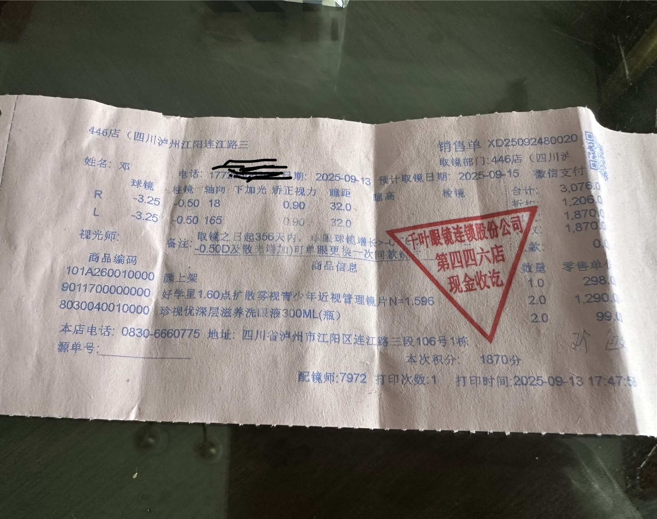9月13号在十五中旁边给娃娃千叶眼镜配了一副眼镜,娃娃说戴起头晕,就没有戴,以免影响上课,我把发票拿出来看,上面有一个项目是两瓶洗眼液300毫升/瓶,但是我并没有得到洗眼液,他们给我解释说是给我的叶黄素,去配眼镜的时候给我说叶黄素是赠送的,他们存在误导消费者,现在我要求退货