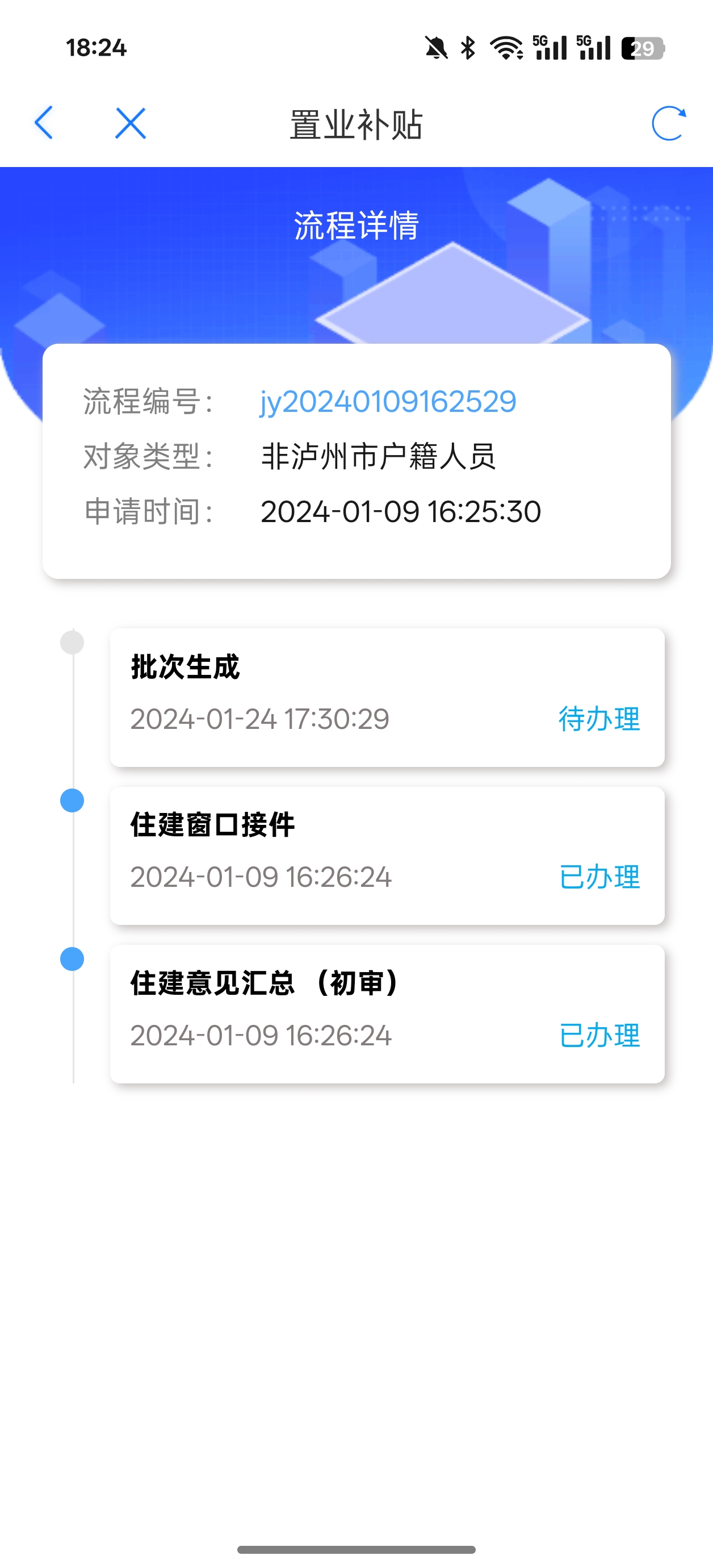 2023年9月购买蓝博湾的房子,当时有置业补贴政策,现在已经两年了,为啥置业补贴流程始终停留在“批次生成”进度这里,到底是怎么回事?