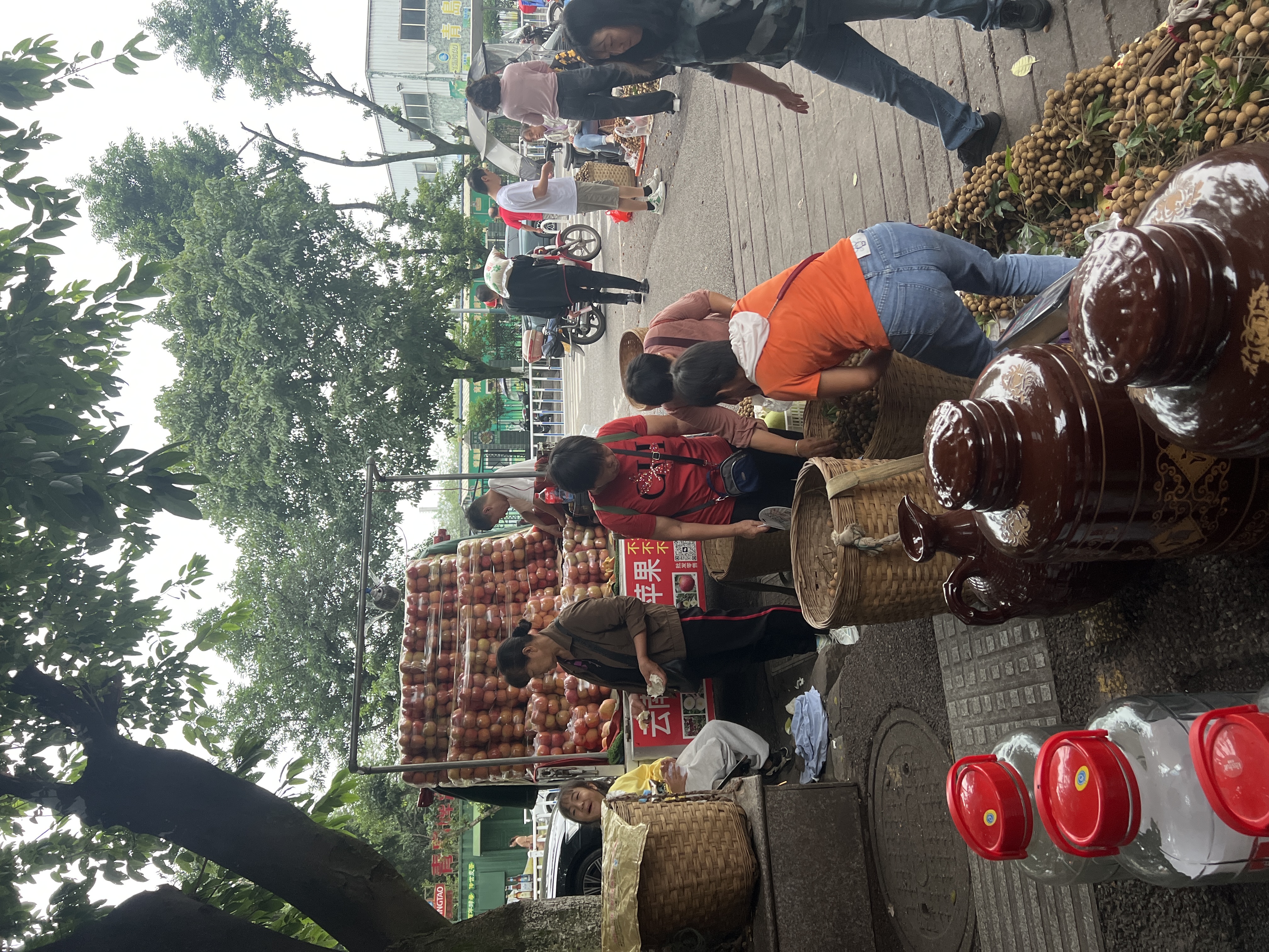 鱼塘农贸市场外主干道外地牌照小型货车横停,占用人行道摆摊