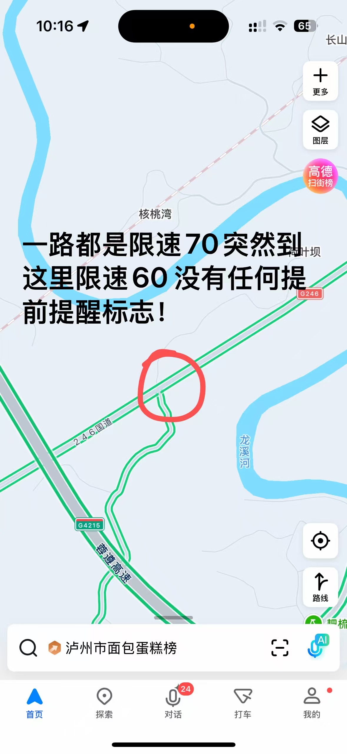 1、泸州市龙马潭区246国道上行268公里963米至275公里308米处设置不合理测速,246国道一路都是限速70为什么突然到这个位置限速60?请给予合理解释?而且没有任何提前提醒限速60的标志导致了很多车在这里违章,是设置问题导致了很多车在不知道的情况下违章,这些违章是不是应该取消?