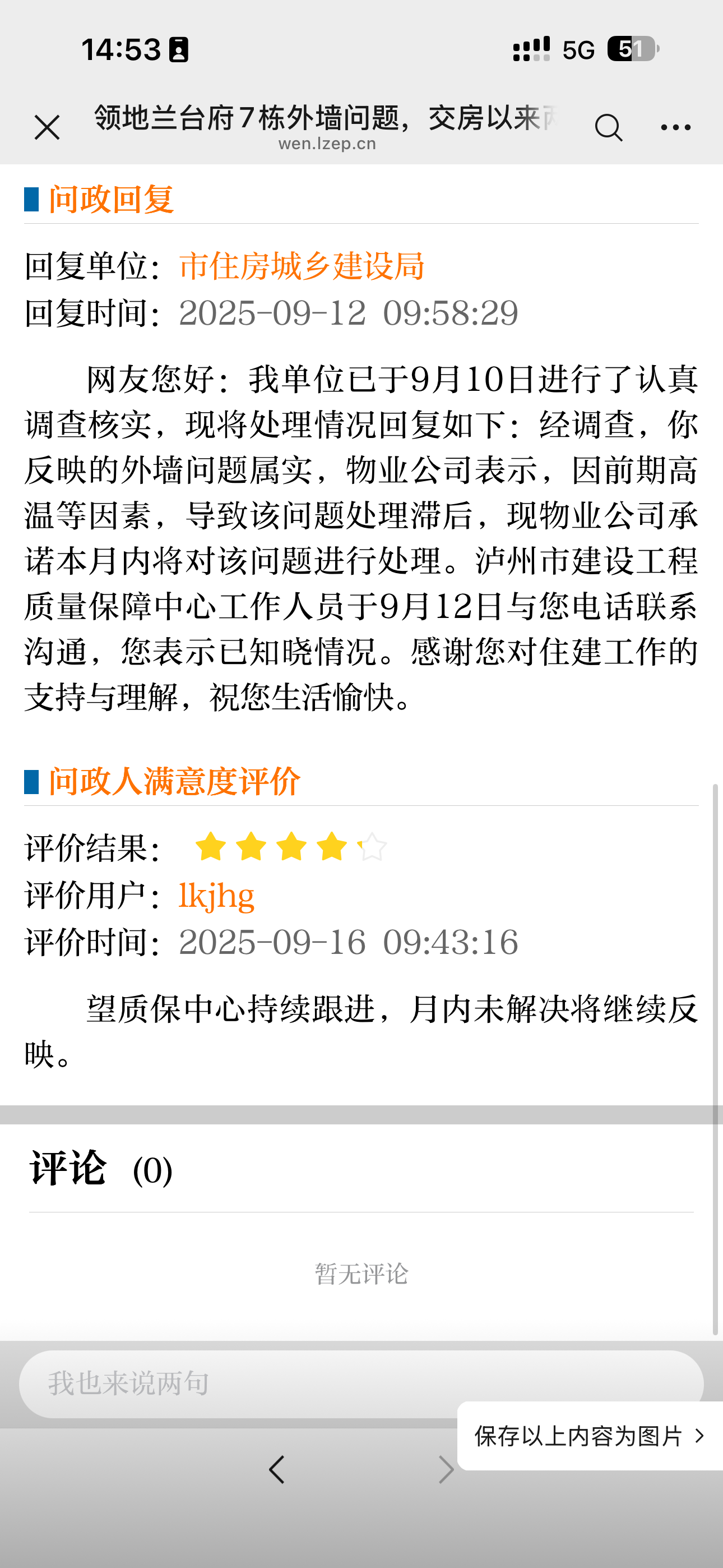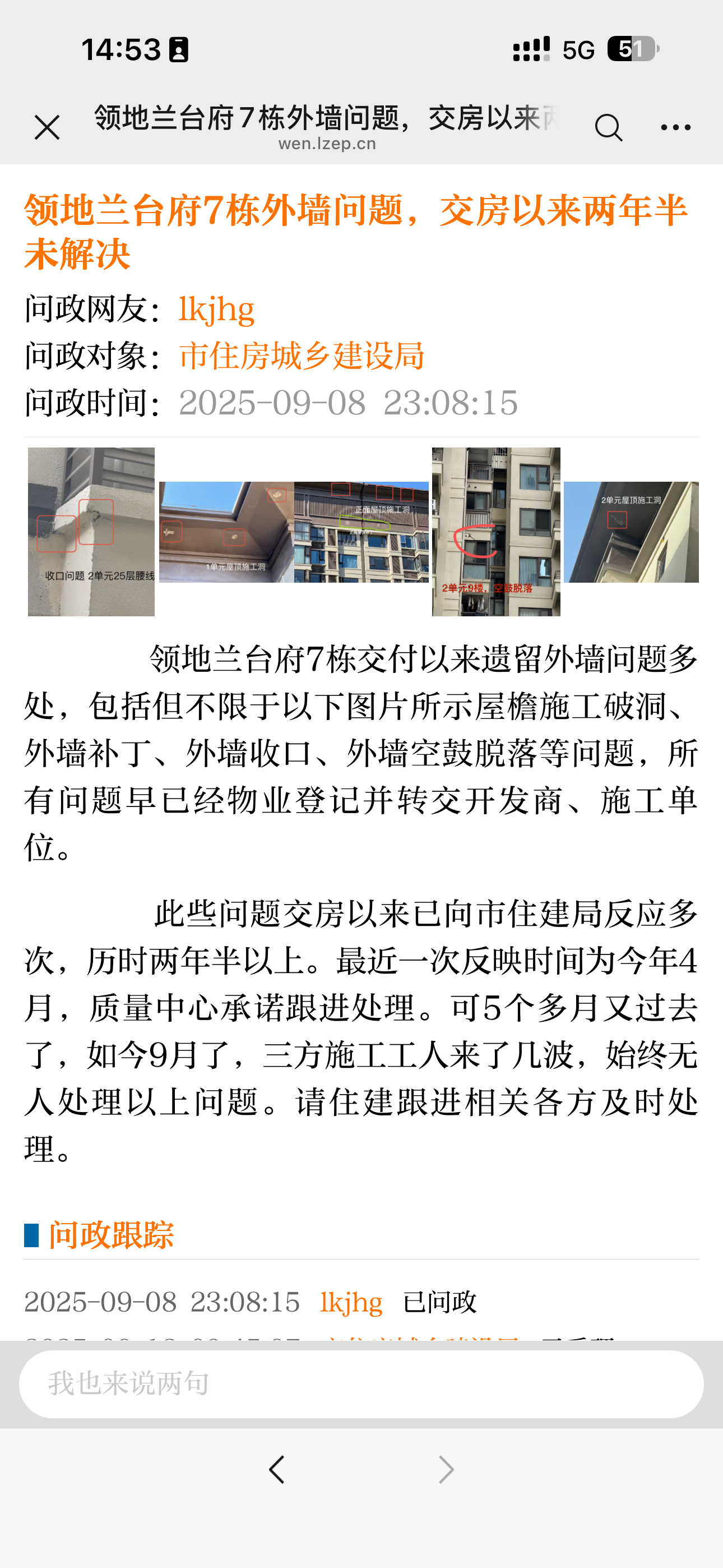 领地兰台府7号楼外墙问题,再次无故拖延未解决