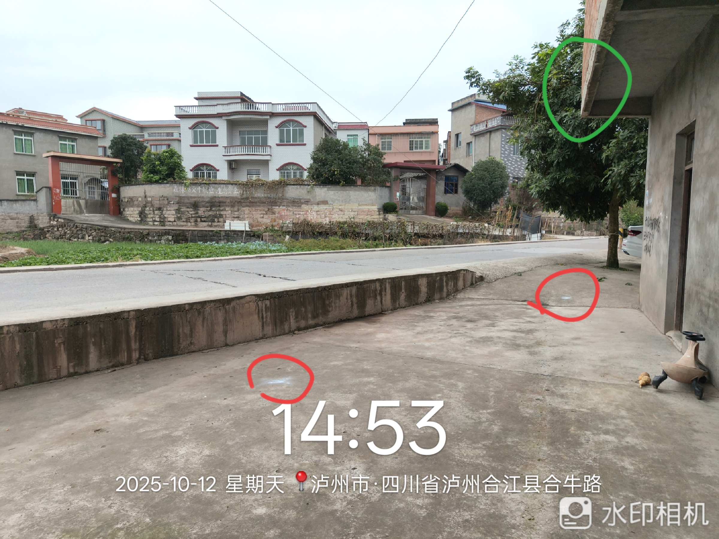 而前两天,就有人来打标记(当时无人在家),在硬化地面画白点,在土地面插竹片片,我家坝子里也有白点(图中两个红圈处),其中一个点已经与房屋二楼主体墙面几乎形成重合(可参考地面屋檐水滴落痕迹看)。我家门口的公路是鑫阳钢铁厂至重庆永川区的必经之路,目前每天都有数不清的重挂大车来往,未来不管是我的房屋、还是我的家人、还是途径的大小车辆,都将在此有安全隐患!