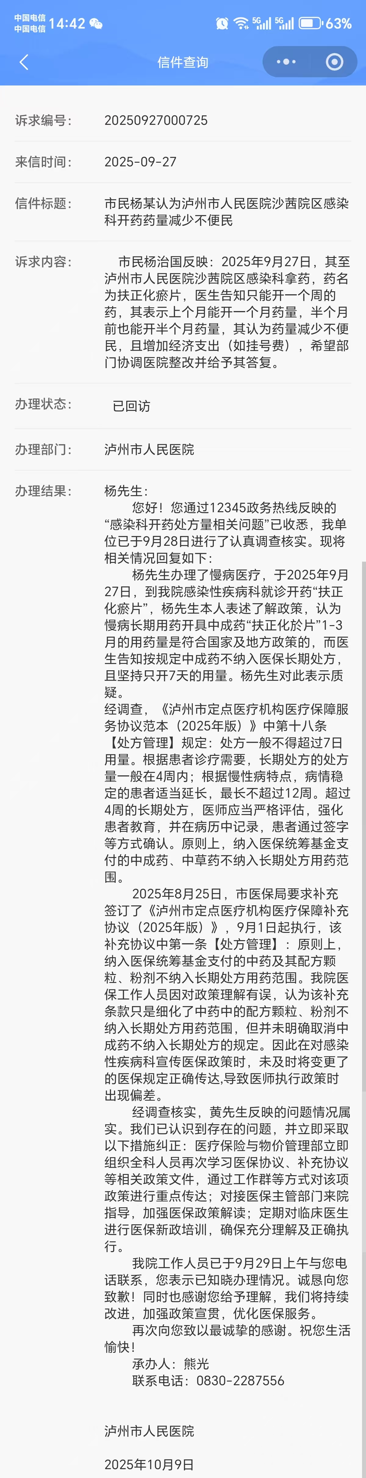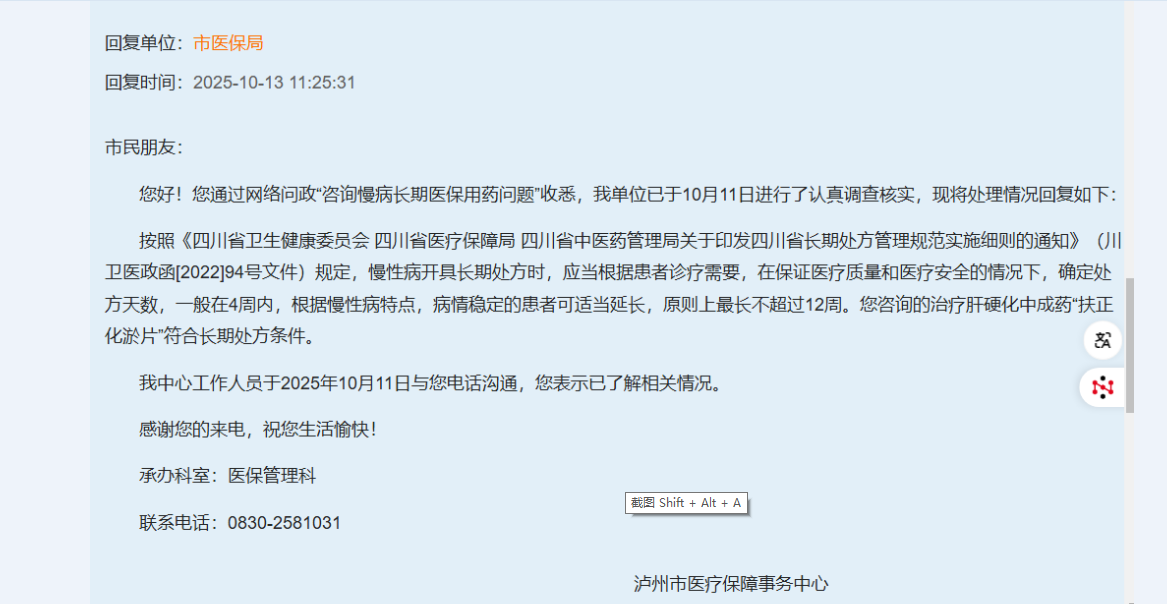 本人于2025-09-27 21:05:23以“投诉泸州市人民医院沙茜院区感染科”为题向市卫健委投诉市人医医生在开具慢性病处方药的工作中没有按规定执行把“扶正化於片”纳入慢病长期管理用药,只为患者开具七天用药的投诉的行为是错误的,并提出了此药应为慢病管理用药的依据是泸州市医保在2025年8月25日制定的泸州市定点医疗机构保障服务补充协议。但卫健委网络工作人员未经认真核实,就以此药只开具7天用药是正确的为由回复本人,这是一种新时代的懒政、不作为。现本人提供市医保局在网上问政本台、市人医在12345平台回复此药应纳入慢病管理,可以开具4周、最长不超过12周的回复截图,请卫健委对本人问政完全错误的回复予以解释和说明