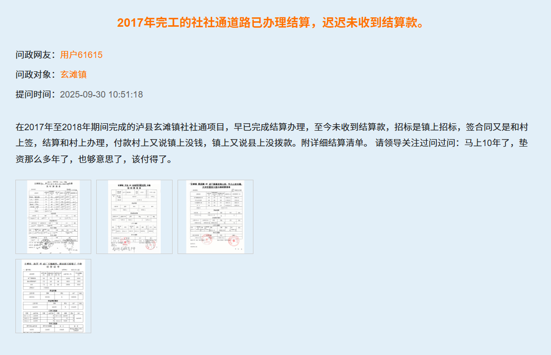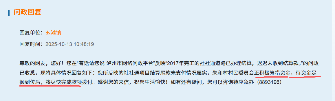 已问政玄滩镇关于已办理结算的社社通工程款支付问题:对方回复事情属实,但需筹措资金,未明确资金筹措时间(详附图),目前距离办理结算完成差不多8-9年了,给了8-9年时间筹措资金,还未筹措完成,一共才30万左右,竟然还需要时间。我有以下问题需要财政局回复: