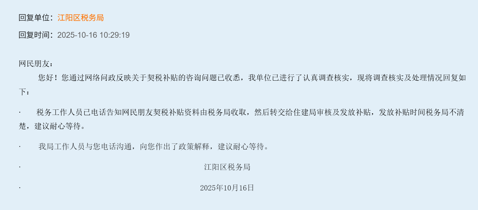 你好,我是鸿通翡翠滨江的一名业主,我于2020年3月购置房产,签订合同,于2023年3月23日缴纳契税,当时政府对契税有优惠政策,好像是优惠15%,我在原四川税务APP(现为电子税务局APP)缴纳契税,然后在龙透关市政务服务中心开具完税证明后,将完税证明、身份证复印件、银行卡复印件等相关资料交给江阳区政务服务中心(学院西路)相关工作人员窗口处,我于2025年10月15日问政江阳区税务局,税务局查了内部登记台账,我的信息在台账上,资料并没有搞掉,然后税务局回复说是将相关资料移交给住建局,我想咨询这笔款项大概什么时候能够发放?已经快三年了。