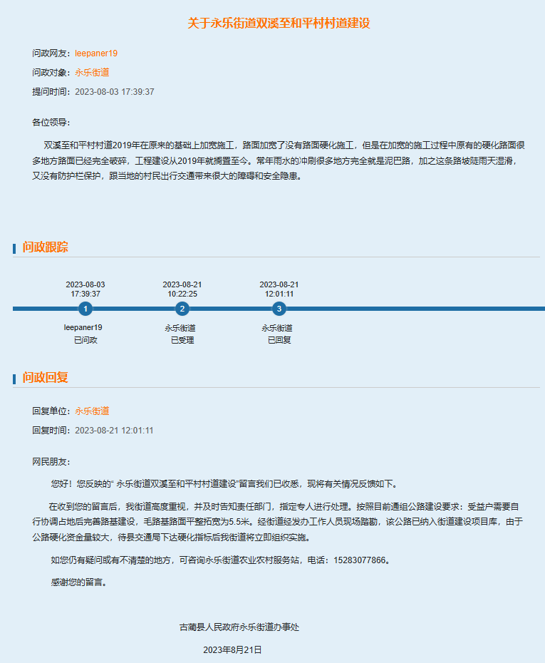 另该村还有几条道路至今未得到相关解决,希望能用实际行动解决问题,辉煌“十四五”收官在即,壮阔“十五五”即将起航,希望有关部门能做好“为人民服务”,能真实解决基层的相关问题,能抽出宝贵的时间和精力,希望尽快制定施工计划,明确硬化时间表,避免因审批流程过长导致问题拖延。
