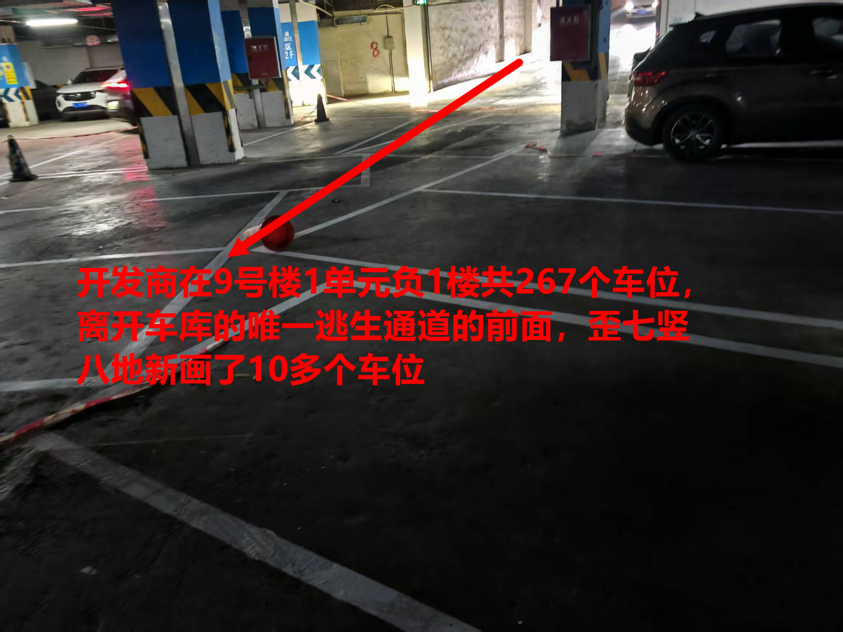 2025年10月23日,开发商鸿通华远公司在车位延期未交付的情况下,在9号楼1单元负1楼共267个车位,离开车库的唯一逃生通道的前面,歪七竖八地新画了10多个车位(见附图),开发商画该批车位存在5大违法问题,是典型的“为了多卖几个车位,不顾业主死活”的行为。烦请市政府立即成立联合执法组,对开发商的严重违法行为进行处罚,并严令开发商恢复如初。