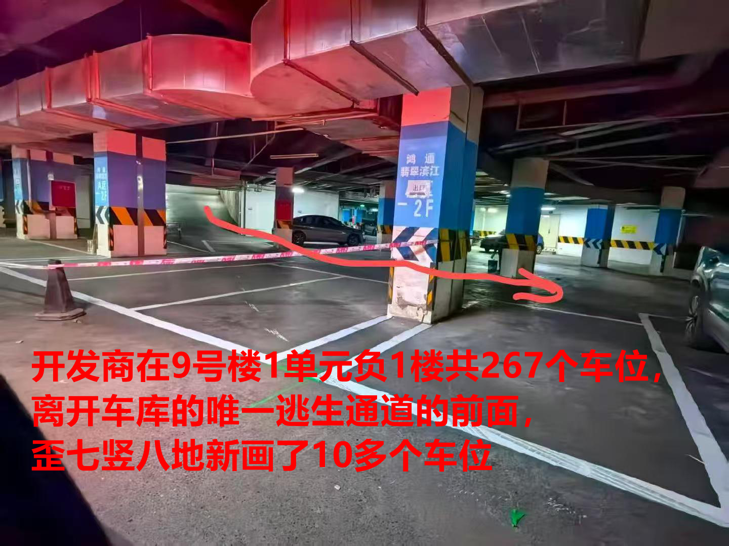 鸿通翡翠滨江开发商违法新画车位严重危害消防法和公共安全、侵占人防工程区域