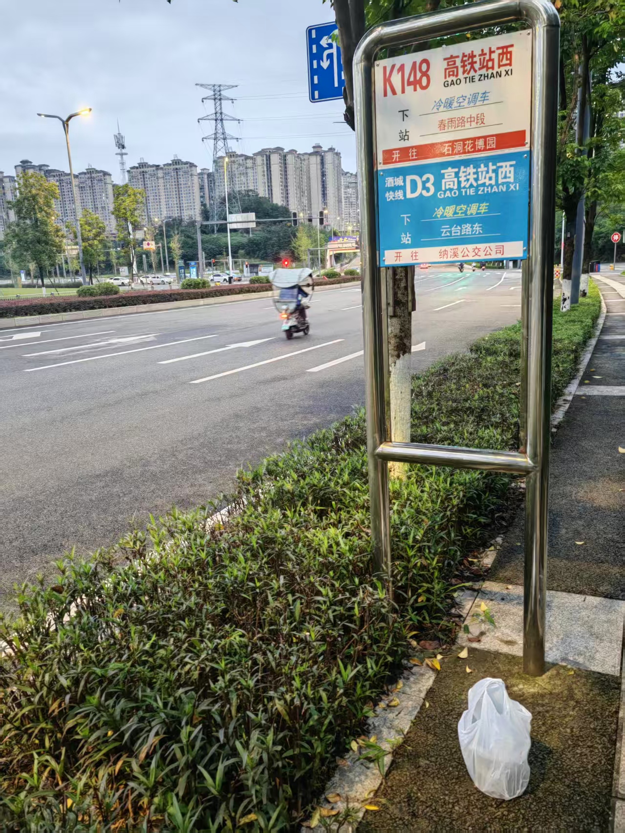 K148路公交车(开往石洞方向)在高铁站西设置了一个公交站,站点设置在道路旁绿化带里,没有预留行人等候和上下车区域,乘坐公交车只能从绿化带里通行,极不方便,且高铁站进出站人流量大,看到人员踩踏绿化带上下车的行为影响城市形象