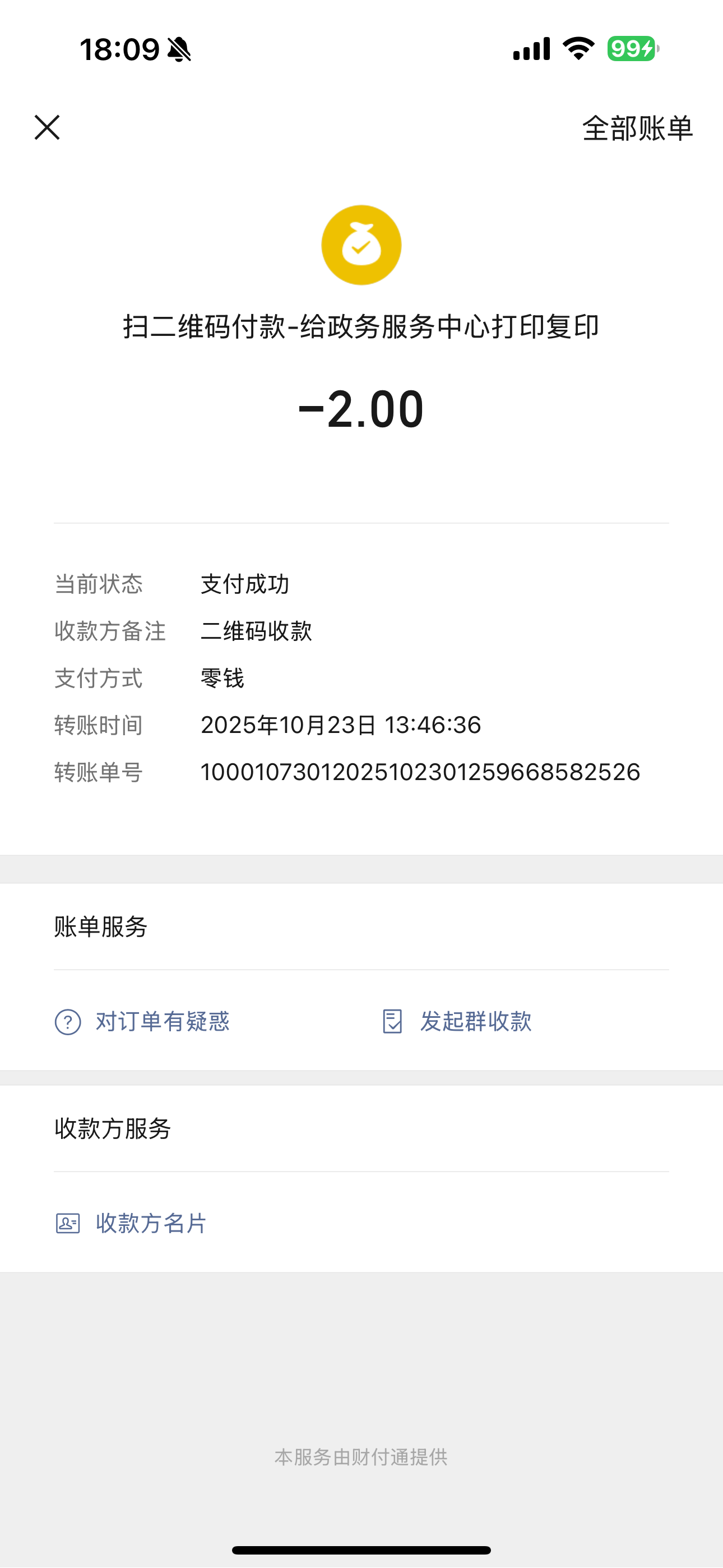 我于2025年10月23日,到江阳区政务中心办理单位职工社保减少事宜。因未带全资料,随到政务中心二楼资料复印处,打印了一张A4纸张的“医疗保险职工减少申报表”,复印处工作人员向我收取了2元的资料打印费。