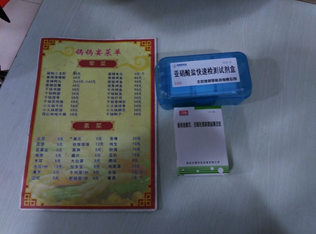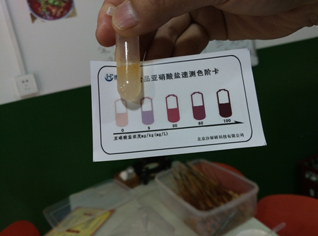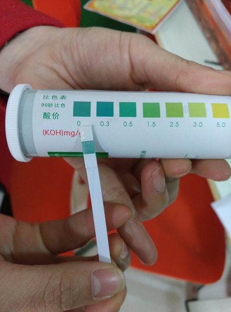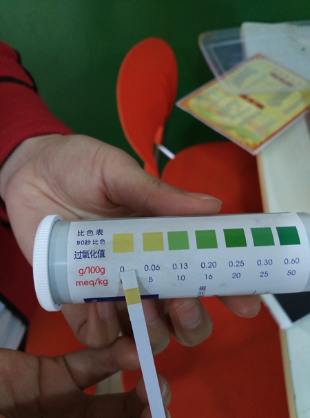 我局接到投诉后高度重视,立即排食品稽查大队执法人员及药检所人员一同前往调查,发现该餐厅证照名为“泸县玉蟾街道锅锅宴夜宵店”,检查厨房,发现其用盐为“池宇”牌加碘食用盐,未发现有亚硝酸盐。我局使用食用油酸价、过氧化值、亚硝酸盐快速检测试剂检测其干锅底油、排骨、牛肉丸(串串)等,结果未发现有变质等异常现象(详见比色卡)。
