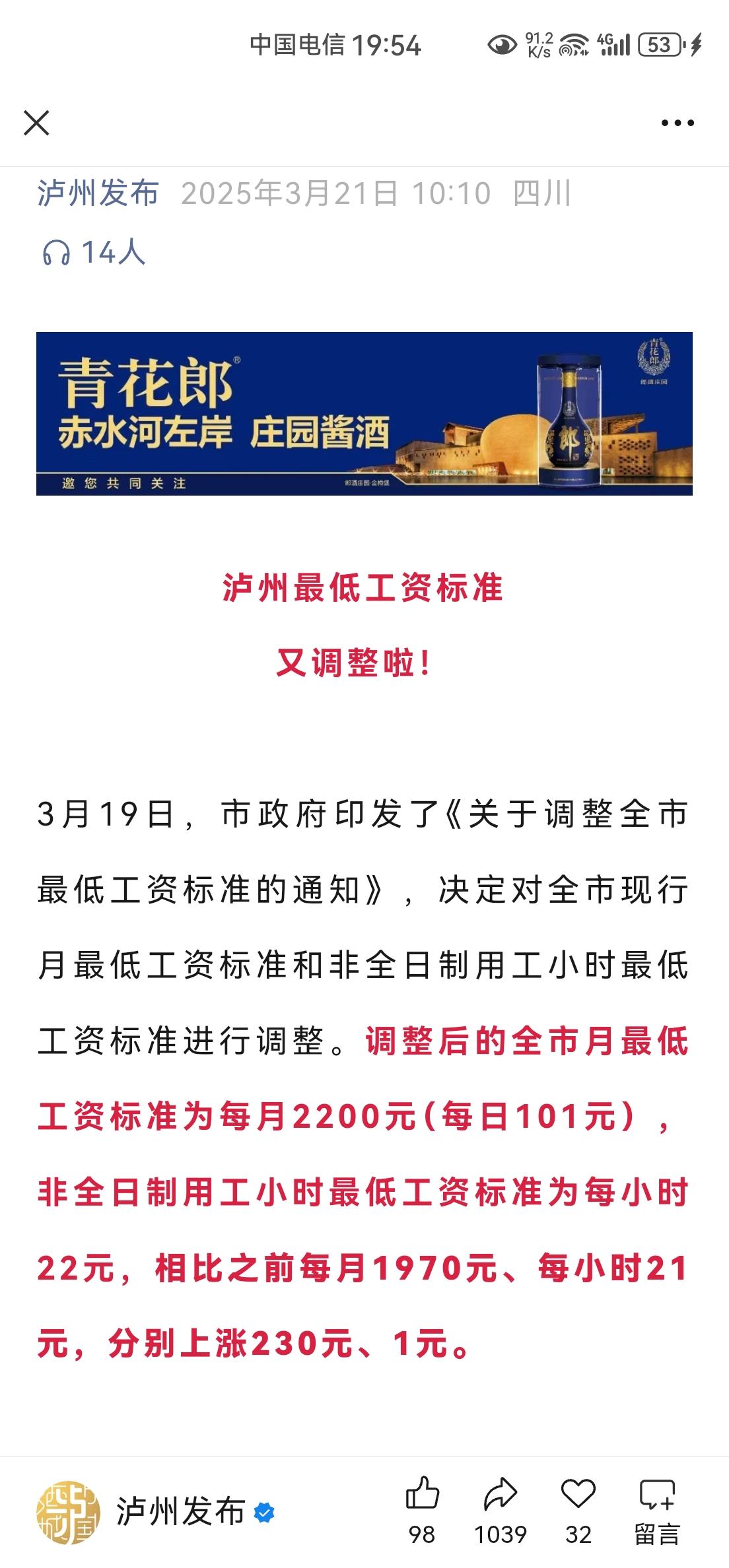 泸州在今年年初发文宣传过泸州的最低工资标准会涨到2200元一月,我们公司还是1970元一月。泰安这面的电子厂应该在涨最低工资这个范围的吧!公司领导在年初说过过几个月会涨最低工资。但是直到10月份还是没涨。也不说了,想问一下这个政策有什么变动没有?什么时候会执行到位!谢谢!公司不发工资条,所以没有工资条可供拍摄。