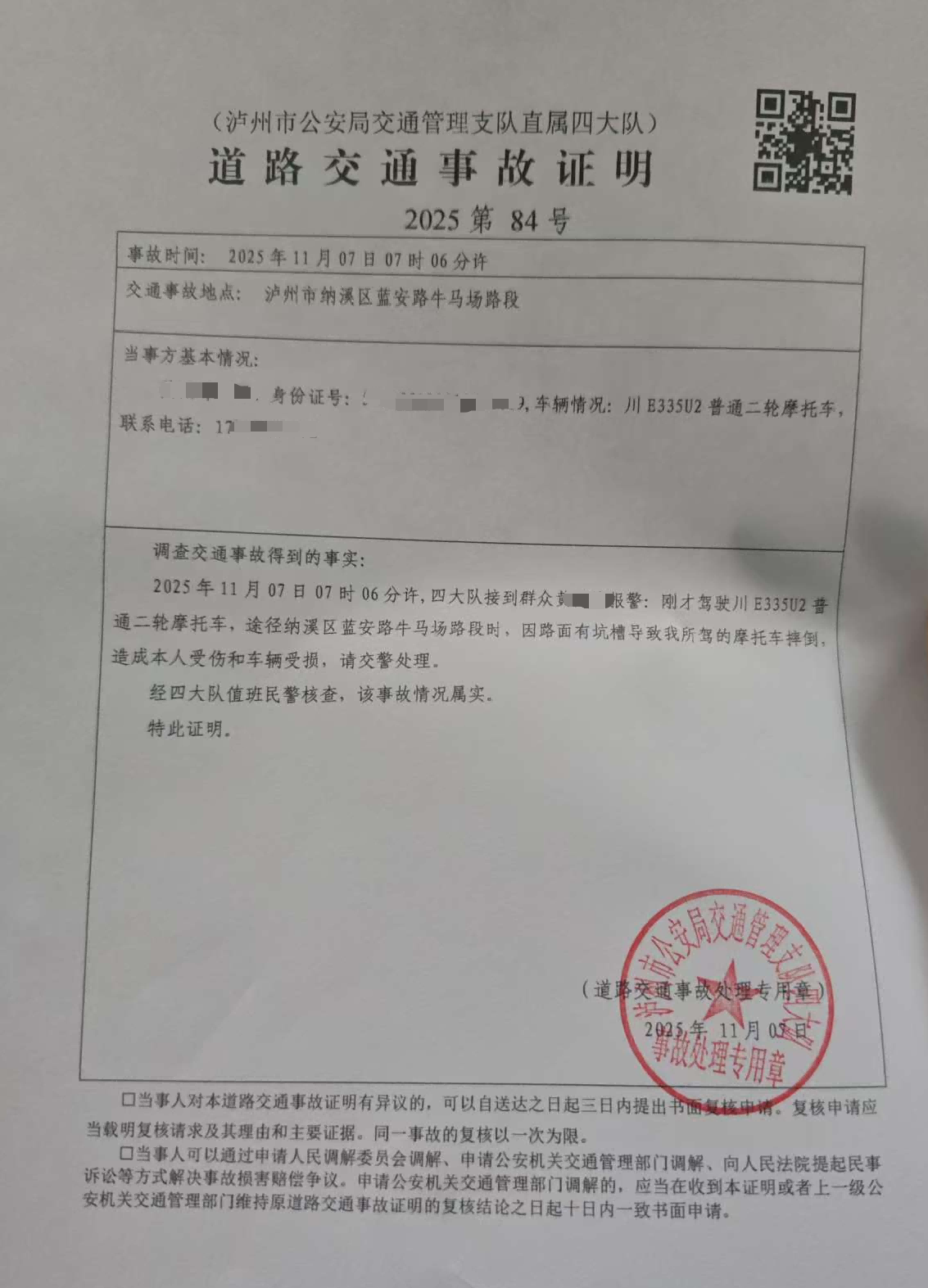 目前我局已对蓝安路四段进行了打围处理,现正在实施城区雨水管网改造项目,将对该路段破损路面进行修复。另外,针对摩托车受损赔偿问题,建议您按相关司法程序予以解决。