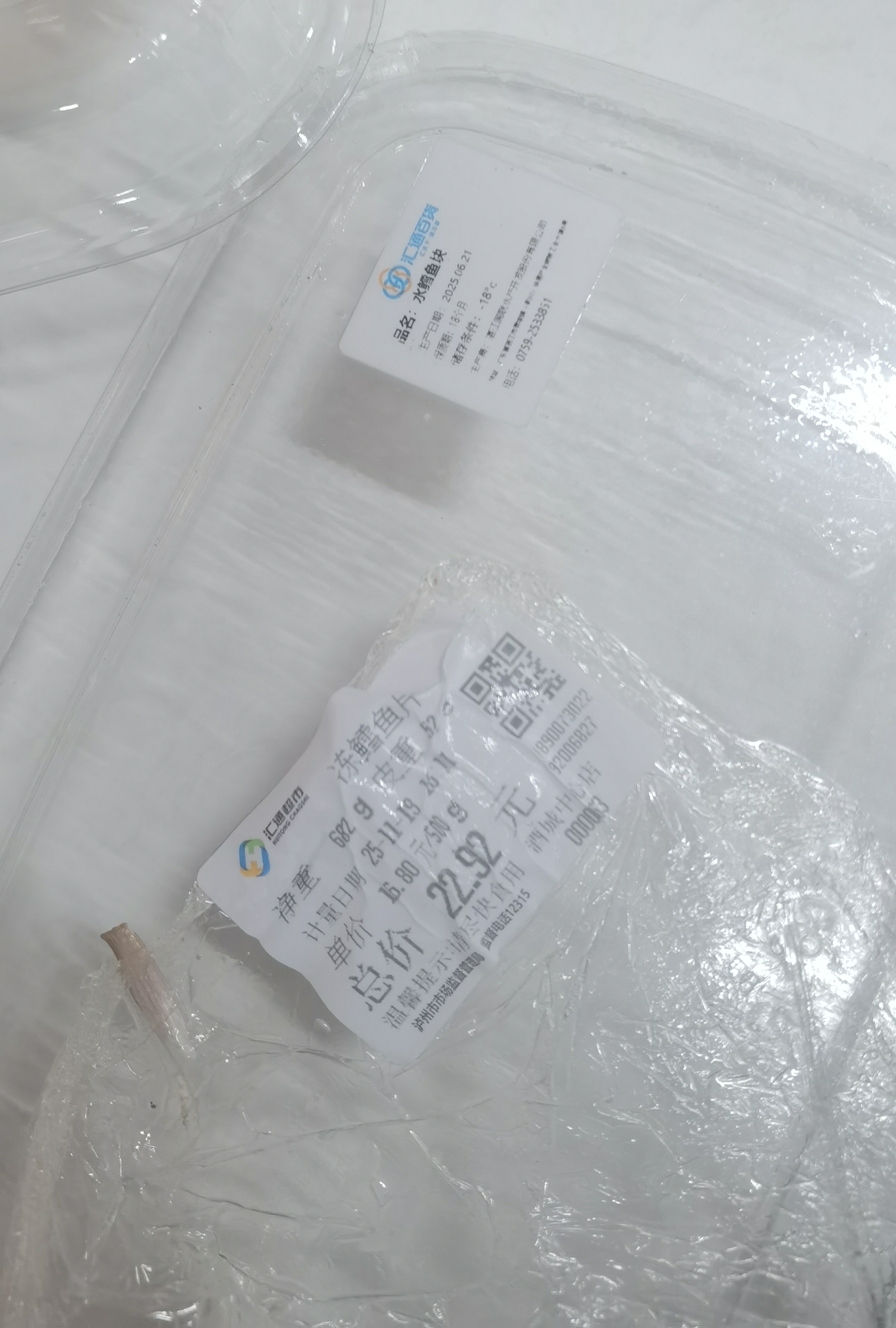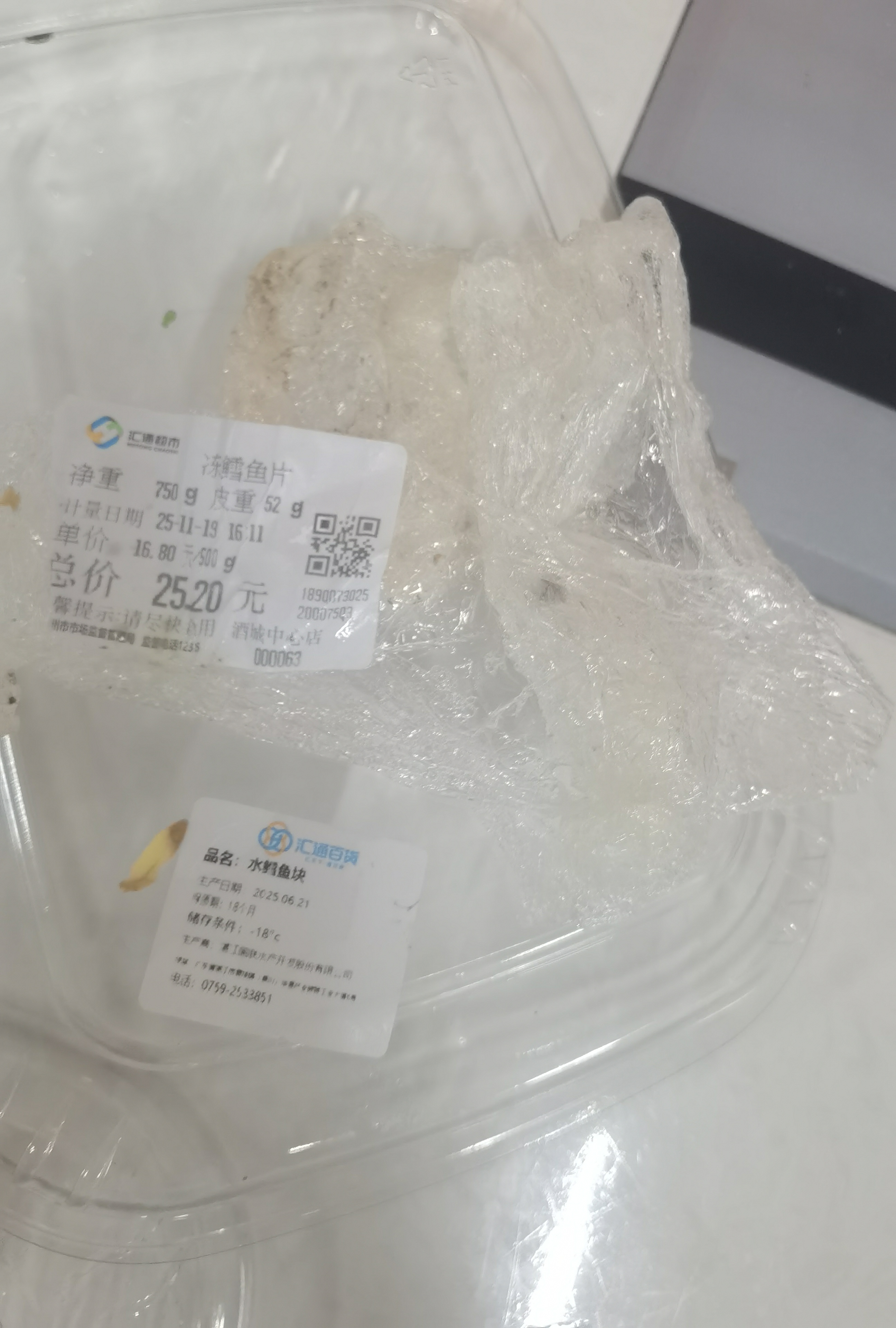 2025年11月19日下午16时左右在汇通酒城中心店购买两盒鳕鱼,购买时冰柜上面贴了一张鳕鱼海报,价格16.8/斤,回家及时清蒸,蒸好后口感与平时完全不一样,不鲜嫩,不脱骨,像啃鸡肉。马上在垃圾桶把购买小票找出,销售小票是冻鳕鱼块,实际商品标签贴的是水鳕鱼,水鳕鱼不是鳕鱼!两者价格相差甚远。