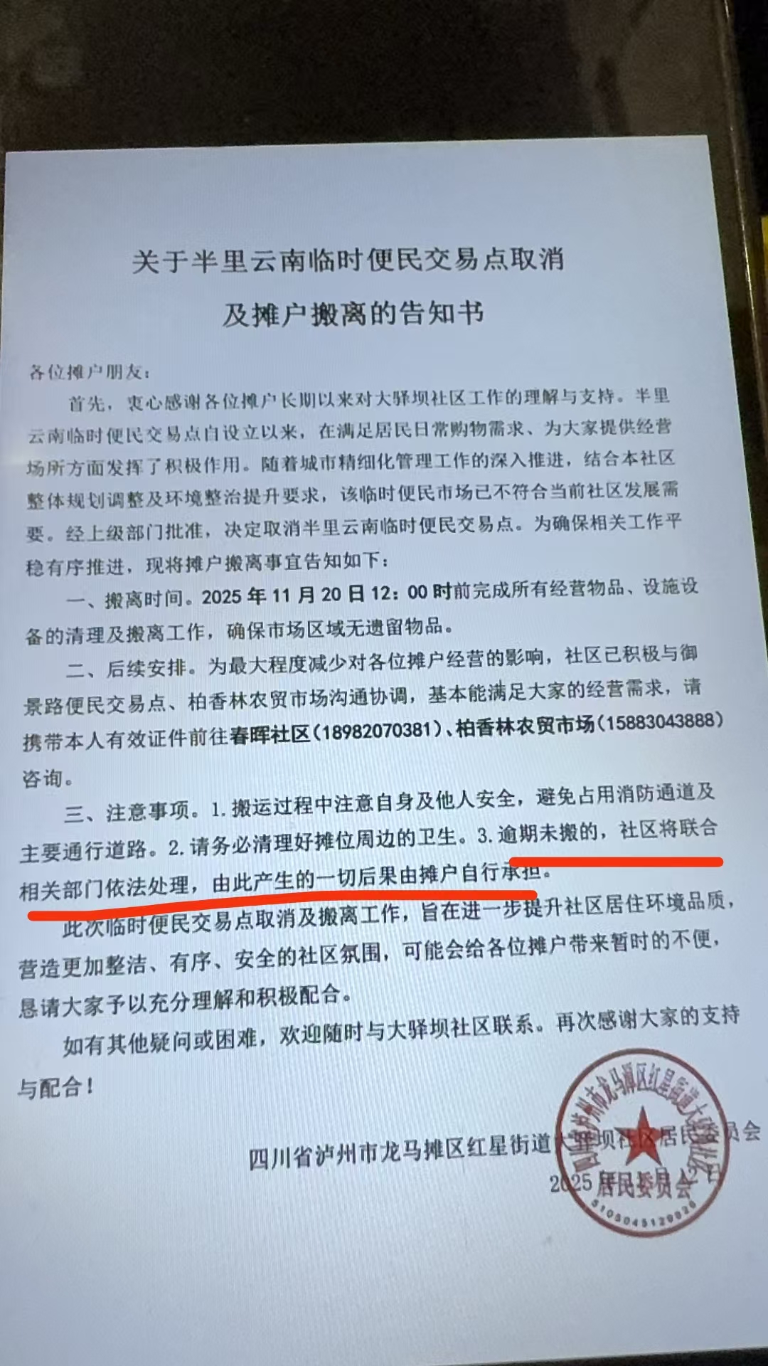 根据龙马潭区红星街道大驿坝社区发布的告知书,半里云南便民交易点11月20日完成所有经营物品设施设备的清理及撤离工作,但是至今还在继续摆摊经营,严重影响小区居民的居住环境,请相关部门切实履行自己的工作职责。