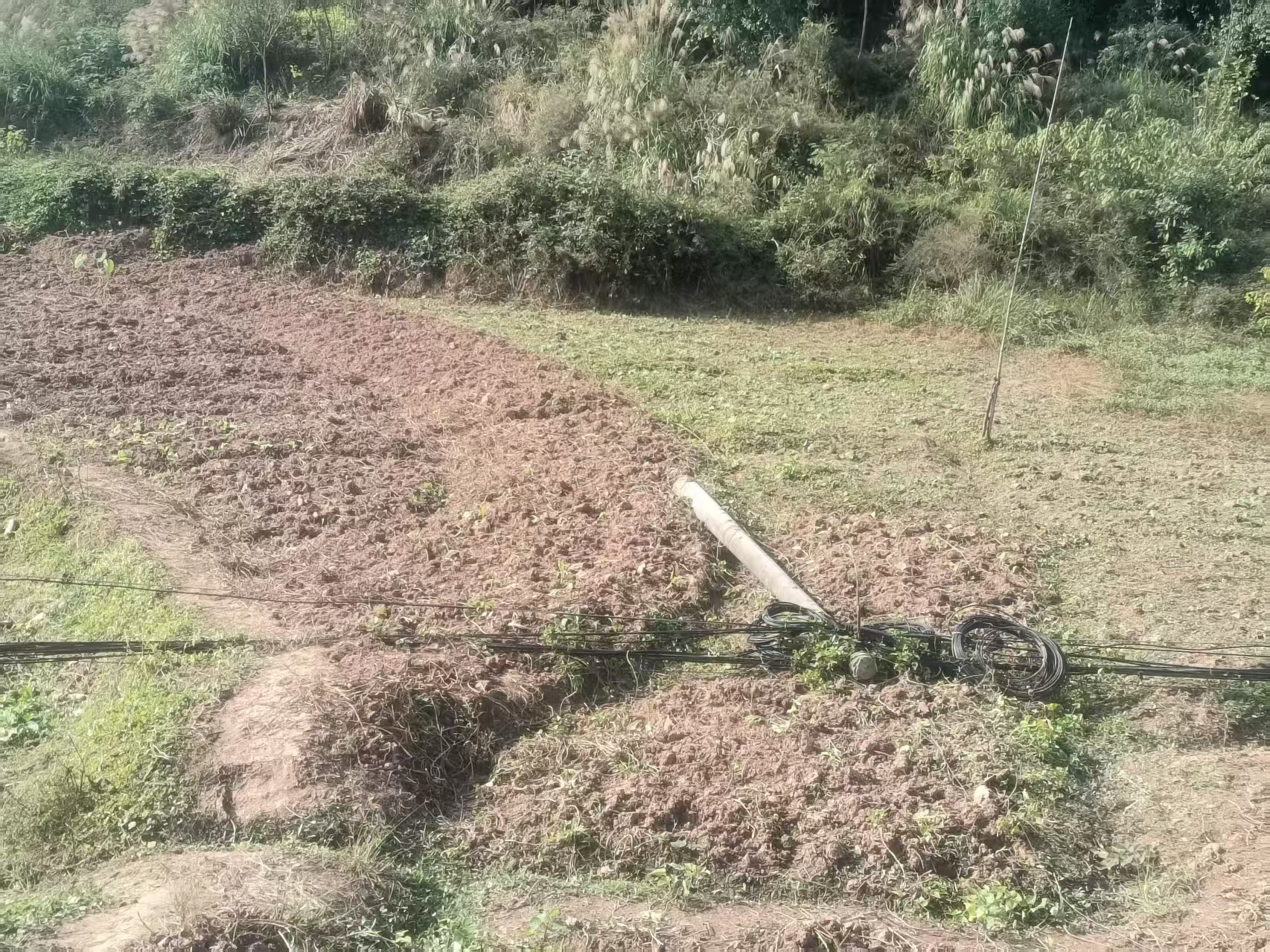 该电桩应该是通信电桩,据说九月份倒在田里面至今无人修缮,每次都是去看了,但无人解决这个问题。现在农村正在挖红薯,现在压着了红薯,农民辛辛苦苦种的,电桩这样倒着没办法挖,况且不知是否该电桩带电?下面的田也无法耕种。这样也存在安全隐患啊!望各位领导及时解决。