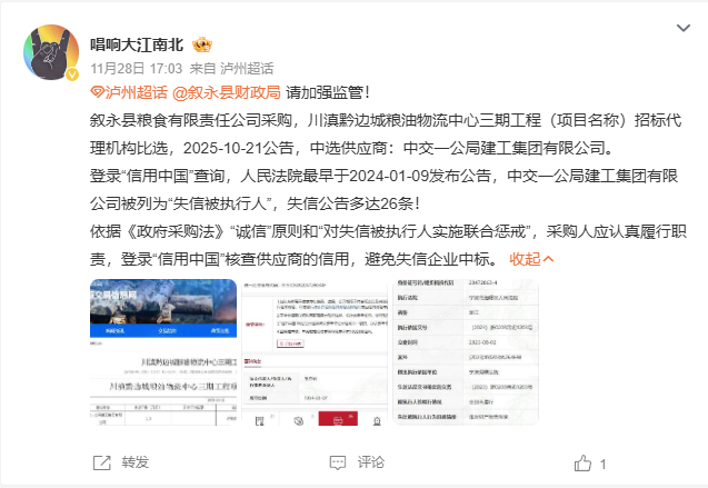 【转自微博,搜索可查】叙永县粮食有限责任公司采购,川滇黔边城粮油物流中心三期工程(项目名称)招标代理机构比选,2025-10-21公告,中选供应商:中交一公局建工集团有限公司。