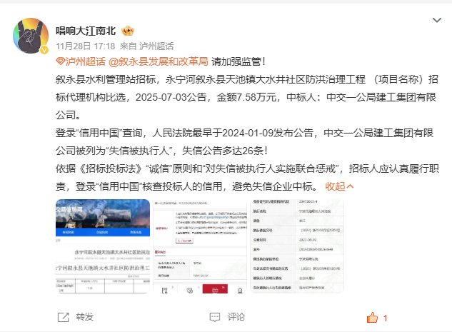 【转自微博,搜索可查】叙永县水利管理站招标,永宁河叙永县天池镇大水井社区防洪治理工程 (项目名称)招标代理机构比选,2025-07-03公告,金额7.58万元,中标人:中交一公局建工集团有限公司。