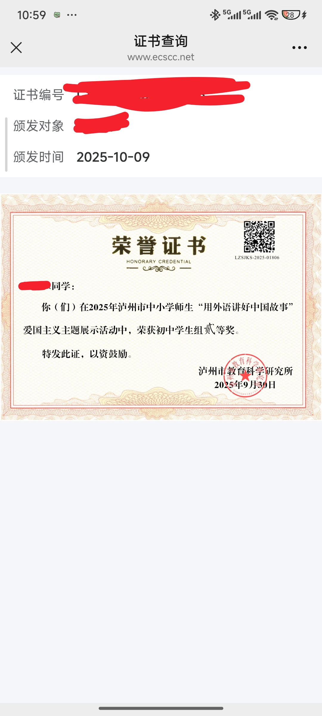 泸州市“用外语讲好中国故事”主题展示活动比赛中,获得二等奖的选手有纸质荣誉证书吗?有的话多久送到学校呢?