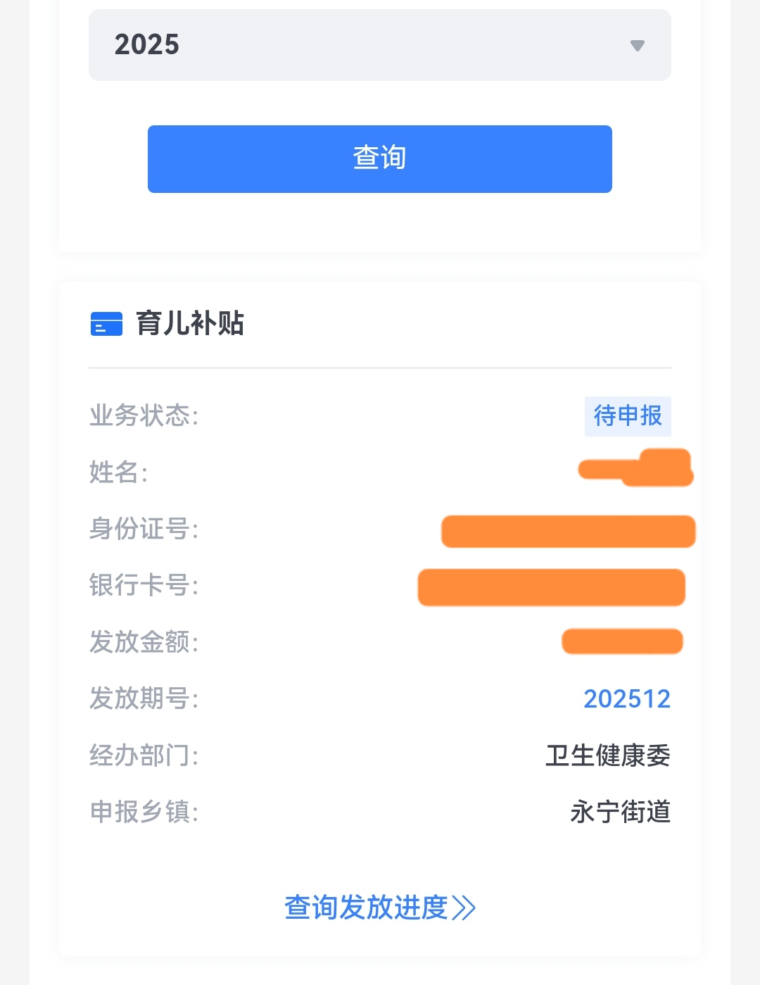 我在2025年8月在支付宝育儿补贴小程序申报育儿补贴,9月审核通过待发放,本月看到通知需要在一卡通小程序查询发放,于是今日在一卡通小程序查询时看到发放期号但申报状态却显示为(待申报)