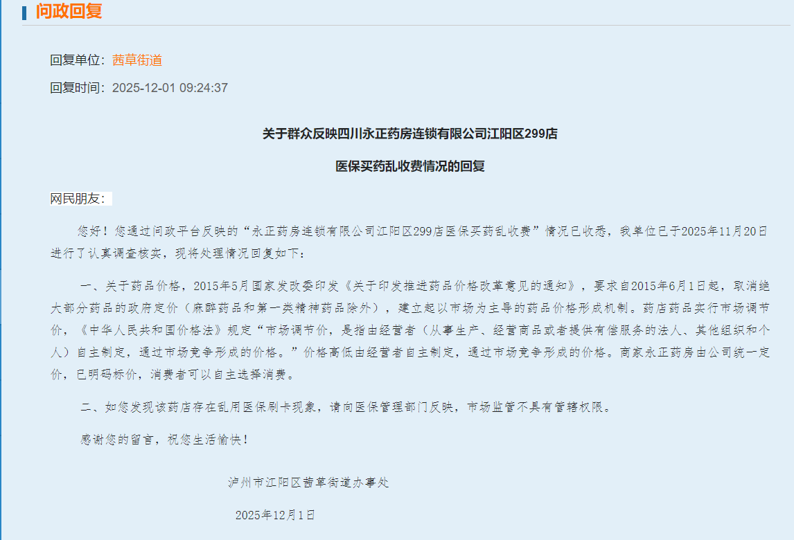 四川永正药房连锁有限公司江阳区299店卖药乱收费!2025年10月19日我在该药店买痛风治疗药非布司他收费48,2025年10月6日我在叙永郎中大药房买的同品牌同规格药品收费28。 之前已问政茜草街道 回复市场监管不具有管辖权限,请问医保药品价格是否由商户自主定价?