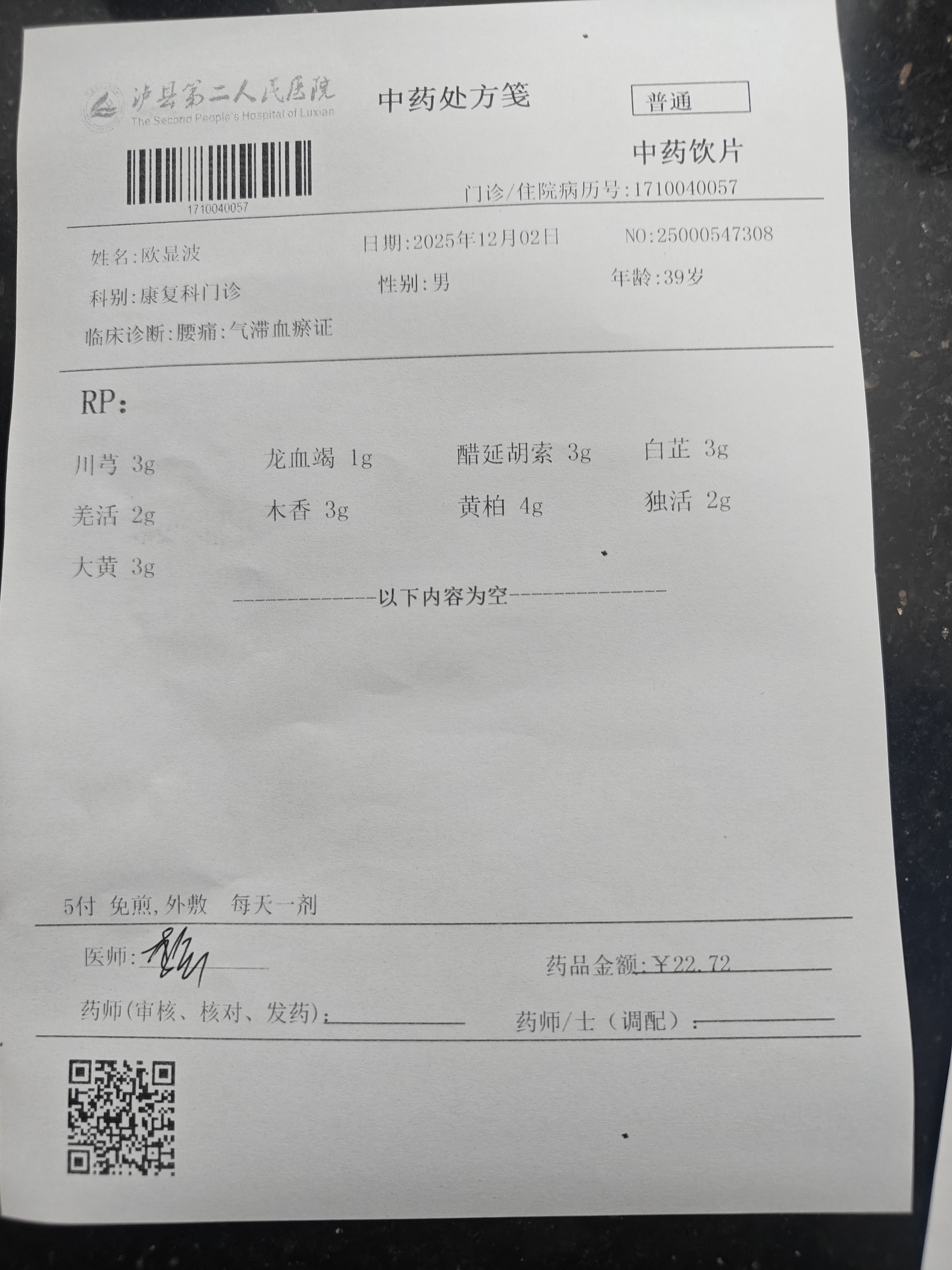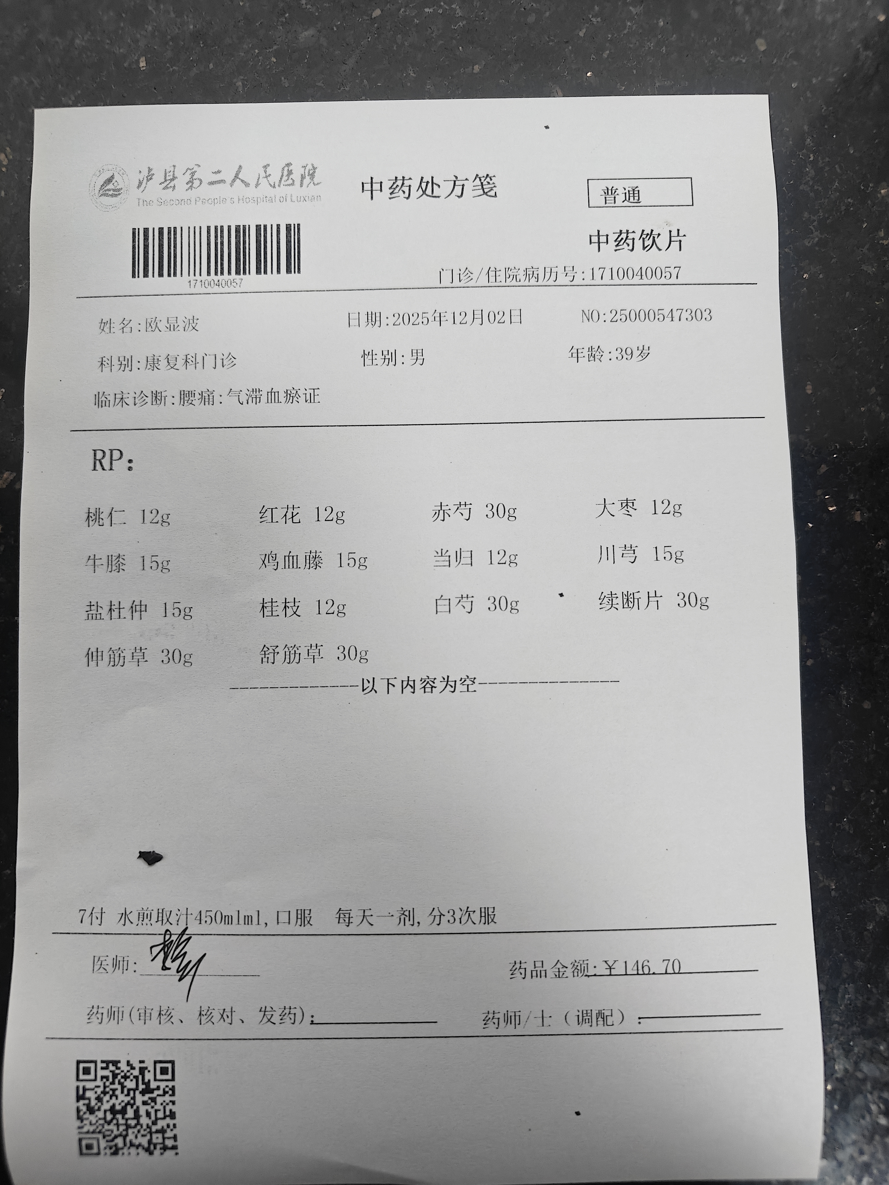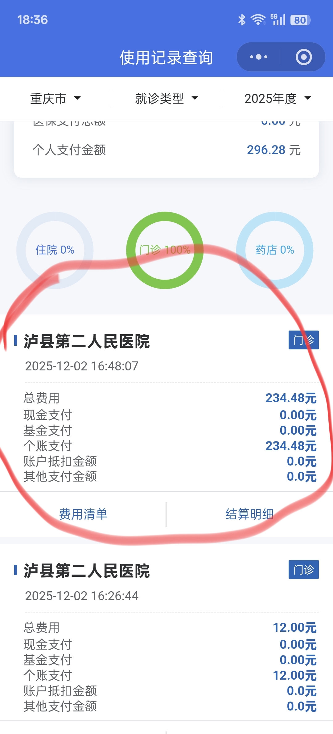 经核实,您现在泸县参加城乡居民基本医疗保险,2025年11月14日与2025年11月28日在泸县第二人民医院就诊,使用门诊统筹基金支付130元。2025年12月2日您在泸县第二人民医院就诊,医生开具甲钴胺片等三味西药及12付中药汤剂,因您曾在重庆市参加职工医疗保险,便使用重庆市的职工医疗保险个人账户全额报销。同时查询2025年12月2日泸县第二人民医院医生开具处方与院端HIS系统,发现处方与门诊收费清单一致。