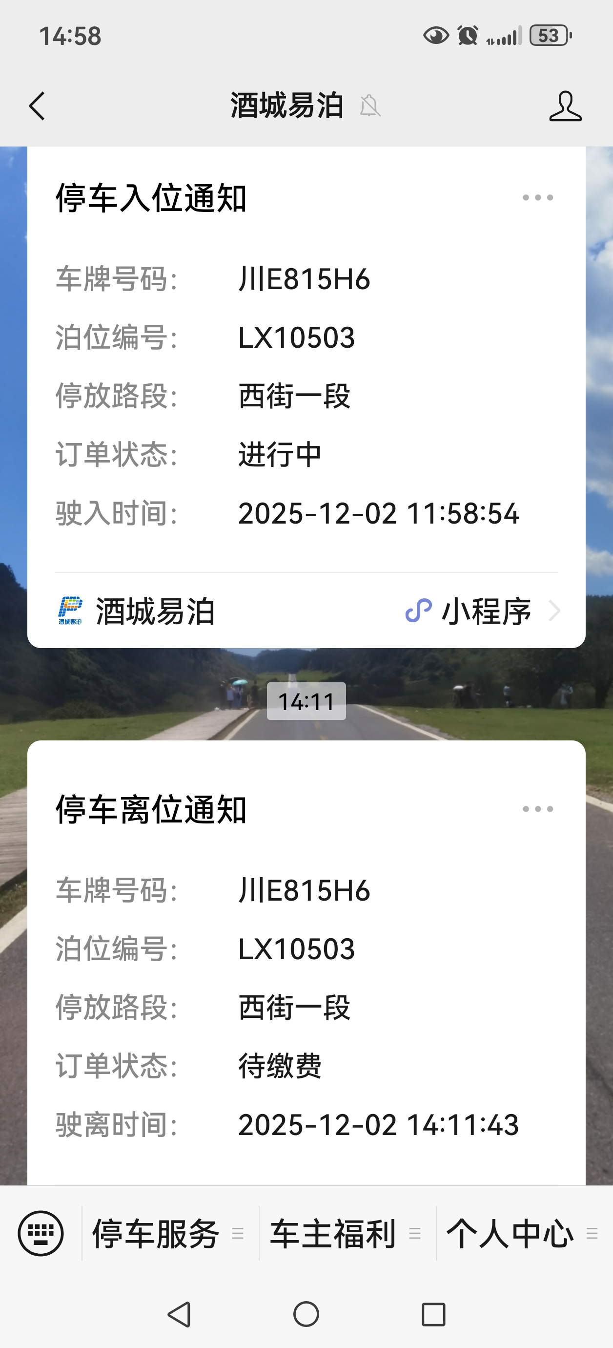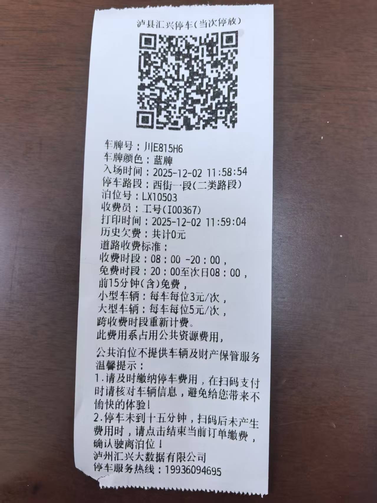 本人于2025年12月2日中午11点59分在泸县福天路停车后在三德面庄吃面,入位时间11点58分54秒,收费员打单时间11点59分04秒。我吃完面在三德面庄付款时间为12点09分54秒,随后开车驶离,停车时长约10分钟,在三街路口有监控录像为证。12月2日14点20分,收到酒城易泊小程序推送代收费消息,显示驶离时间为14点11分,我停车时长2小时13分,并立即致电其公司进行投诉,但未处理,根据小票显示,前15分钟免费,本人未超时,却显示停车时长2小时多,为何出现这种乱象?