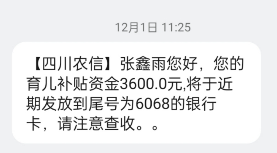 你好,请问在十二月一号四川农信给我发短信说育儿补贴近期会到账,别人发了短信都是第二天就到账了,我等了三天都还没有到 请问补贴还发吗