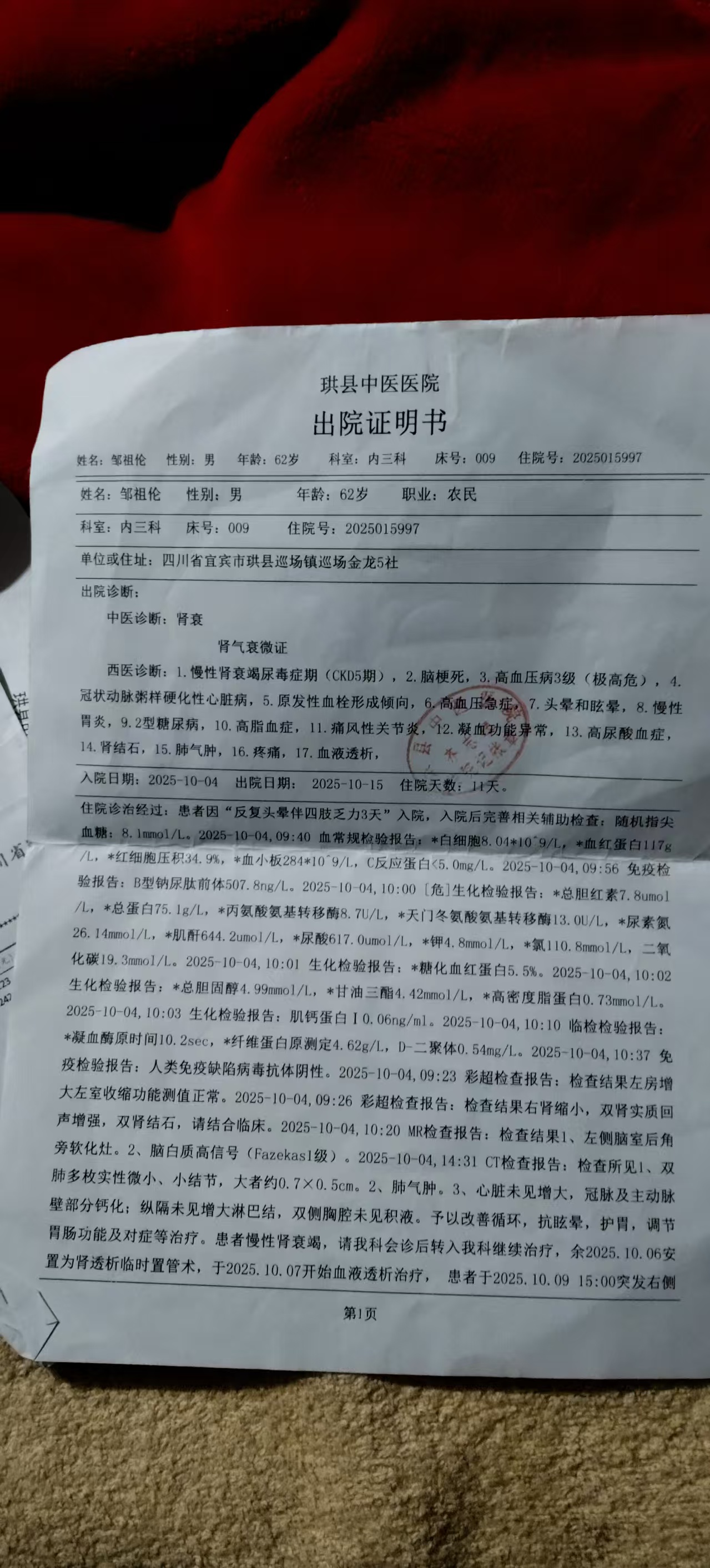 本人邹祖伦,身份证5105211962******97,户籍所在地四川省泸县海潮镇徐场村十三组330号,于2025年10月15日生病住院,经医院诊断患有肾衰竭、尿毒症、糖尿病、脑梗死,高血压痛风性关节炎肺气肿等各种疾病,每周都要透析三次来维持生命,我本人和我的老婆没有工作、没有任何经济来源,女儿大学毕业也尚未找到稳定的工作,目前无固定性工资收入,透析治疗费,医药费、生活费不能负担,无法生活,特向人民政府申请办理低保。我们名下无车无房,我已向海潮政府提供相关资料申请办理低保,但申请被驳回多次,希望领导能核查我的情况并给我一个希望。