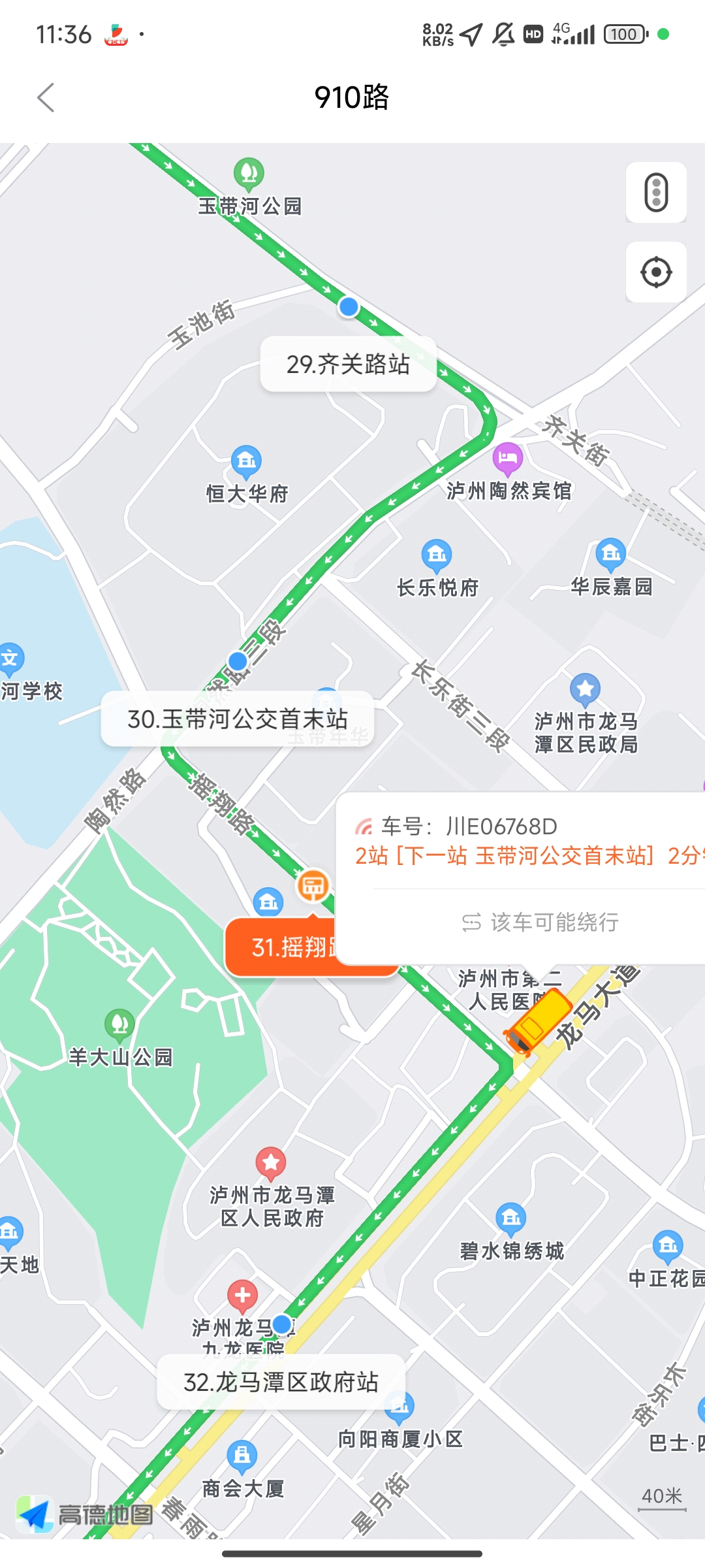 11.36分左右,910路从齐关路到玉带河公交首末站途中不按正常路线行驶至玉带河公交首末站,反而左转进长乐街,直接到龙马潭区政府,这个地方车本来就少,居然还有这种难以置信的情况。望严肃处理这辆车的司机