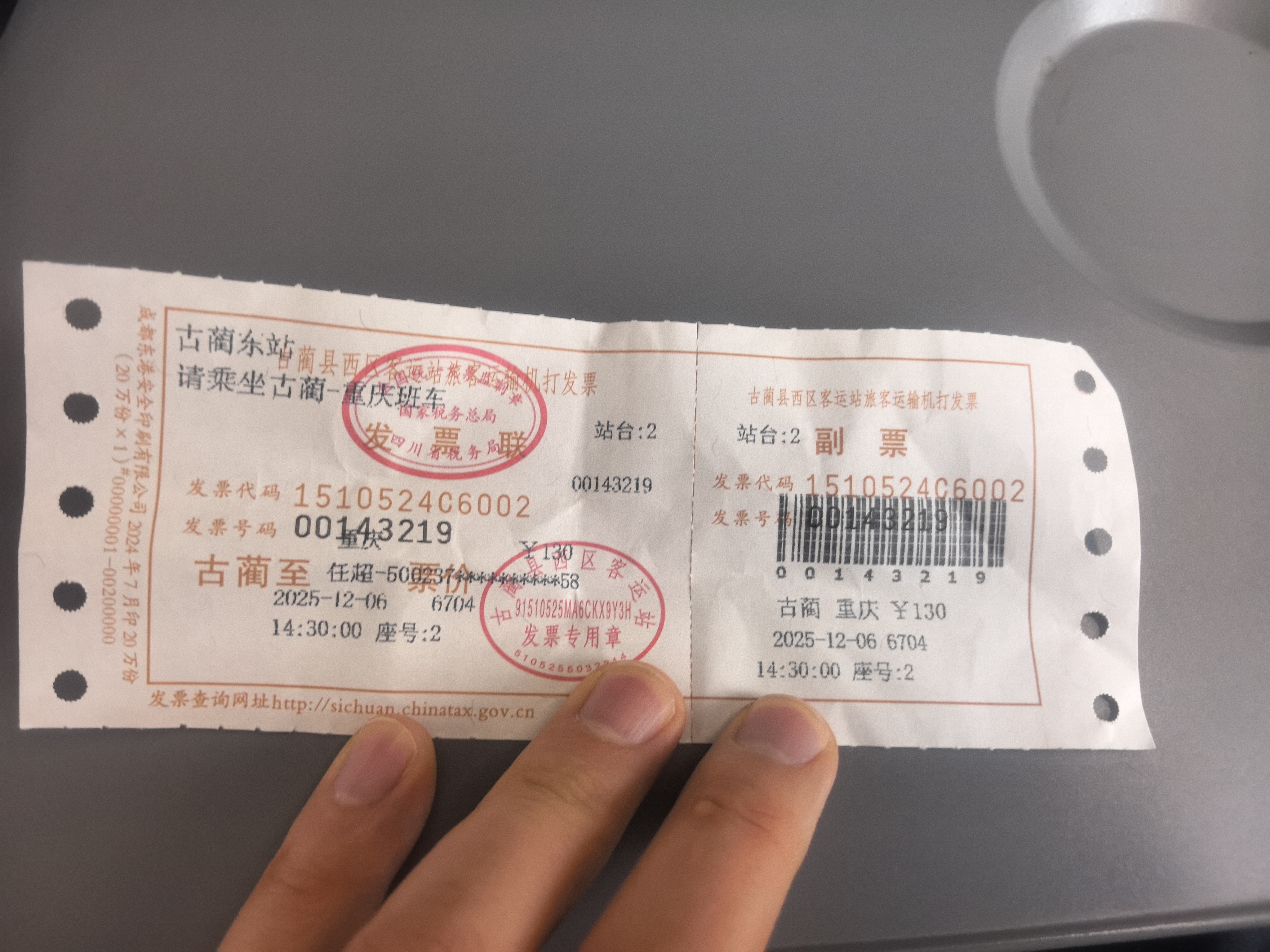 本人购买2025年12月6日14点30分从古蔺到重庆的长途车票两张,(130元一张)由于司机旅途耽误时间,导致我与朋友在泸州市中途下车,改变行程。希望泸州市古蔺县长途汽车站把按照古蔺到泸州的51元票价收取费用,将多余的票钱退给我。(130—51)*2,谢谢(发票号码:00143218、00143219)