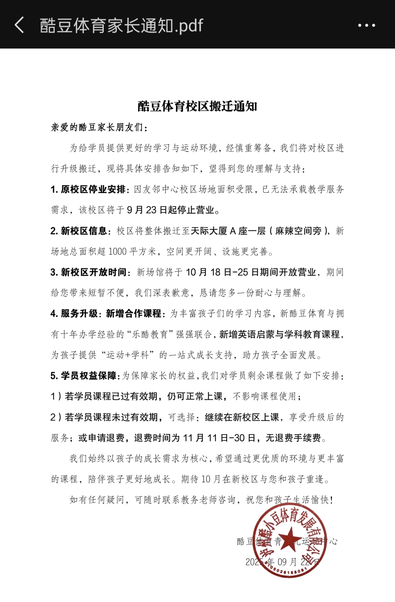 2025年9月,该机构老师通过微信通知,称学校将搬迁,并告知可在2025年11月11日至11月30日期间办理退费。本人于2025年11月15日,按照指引前往新地址——天际大厦A区一楼的“乐酷教育”进行了退费登记。