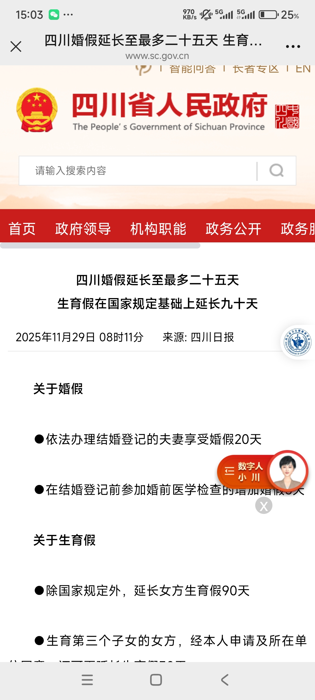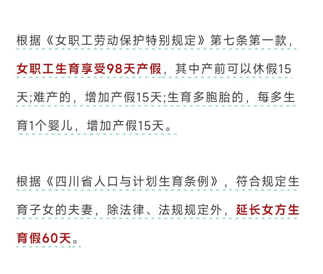 经查,《四川省人民代表大会常务委员会关于修改〈四川省人口与计划生育条例〉的决定》(以下简称《决定》)已于2025年11月26日由四川省十四届人大常委会第22次会议通过,2025年11月28日公布,自公布之日起施行。根据《四川省人口与计划生育条例》第二十四条规定,依法办理结婚登记的夫妻享受婚假二十日,在结婚登记前参加婚前医学检查的,增加婚假五日;符合本条例规定生育子女的夫妻,除国家规定外,延长女方生育假九十日;生育第三个子女的女方,经本人申请及所在单位同意,还可以再延长生育假三十日;男方享受护理假三十日;婚假、生育假、护理假、育儿假期间视为出勤,工资福利待遇不受影响。