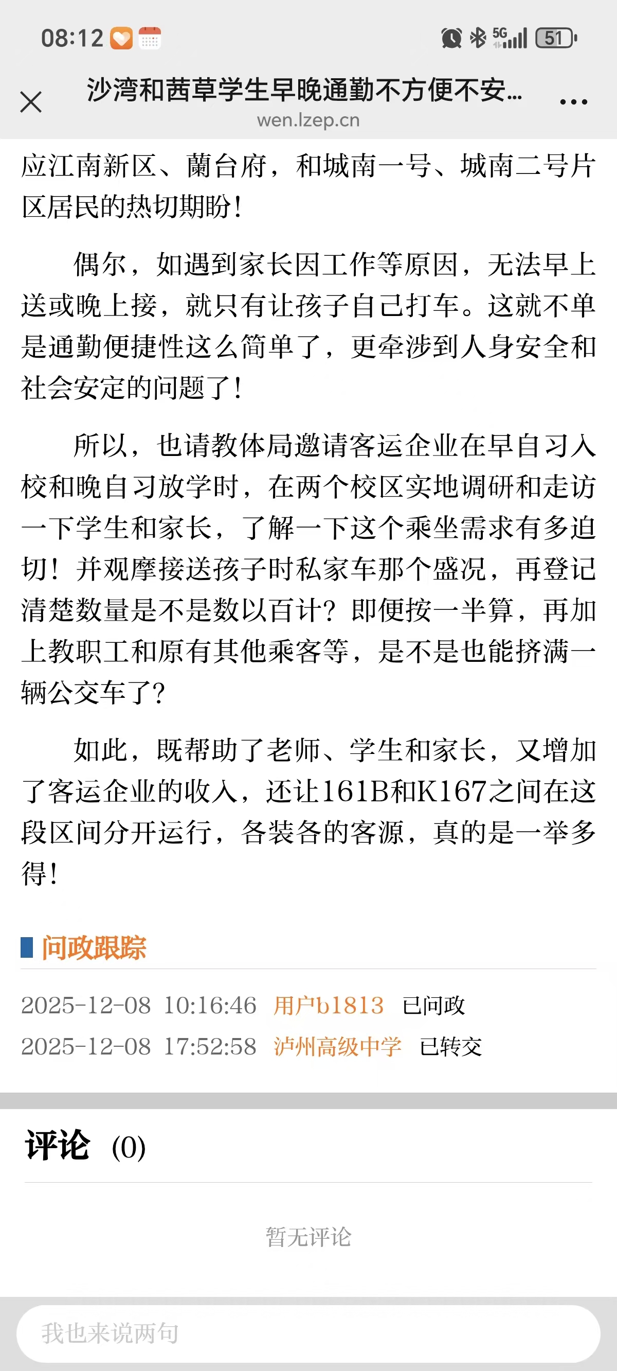 所以,也请交通局邀请客运企业在早自习入校和晚自习放学时,在两个校区实地调研和走访一下学生和家长,了解一下这个乘坐需求有多迫切!并观摩接送孩子时私家车那个盛况,再登记清楚数量是不是数以百计?即便按一半算,再加上教职工和原有其他乘客等,是不是也能挤满一辆公交车了?