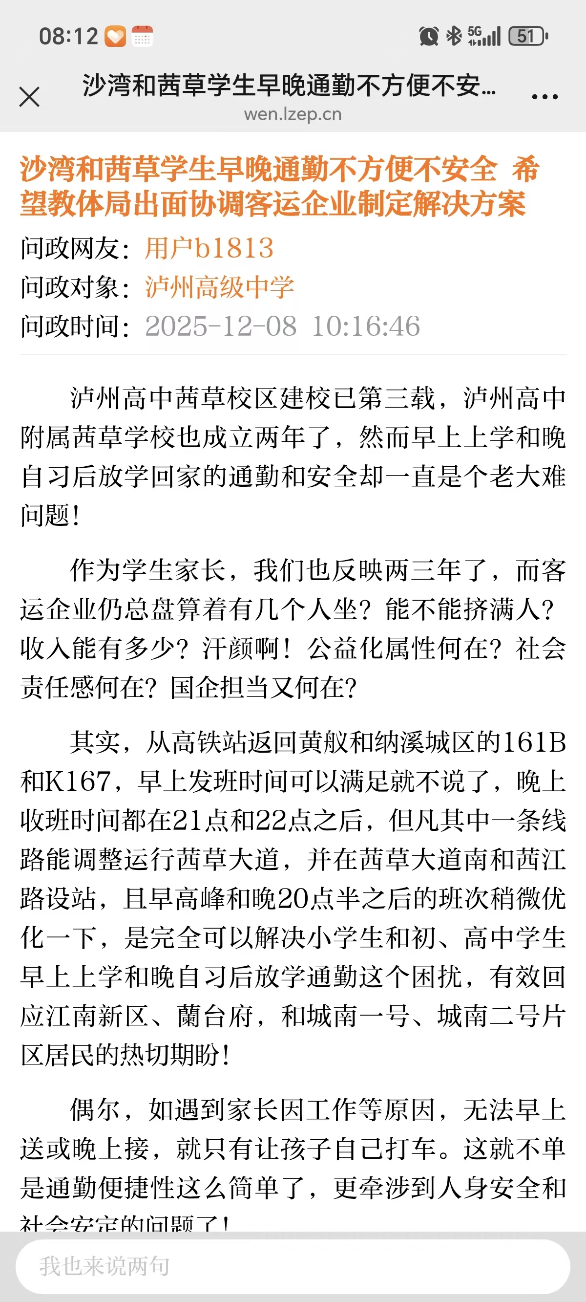 - 问政对象:泸州市公共交通集团有限公司