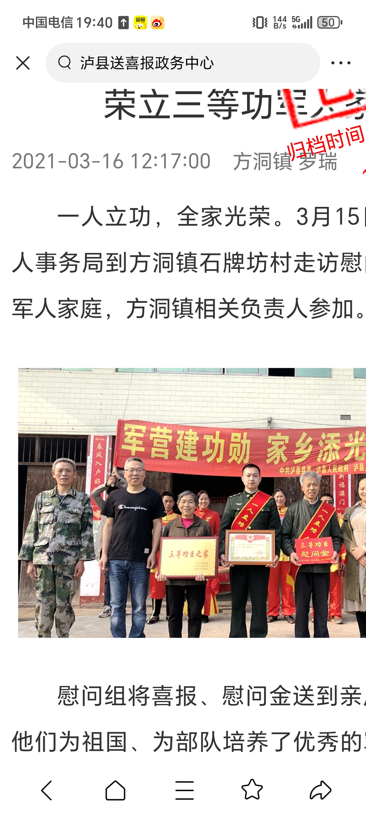 根据上级有关文件要求,为进一步规范立功授奖军人家庭喜报送达工作,自收到文件之日起,结合泸县实际,我县仅对泸县籍现役军人荣立二等功及以上荣誉的家庭授“功臣之家”牌匾。