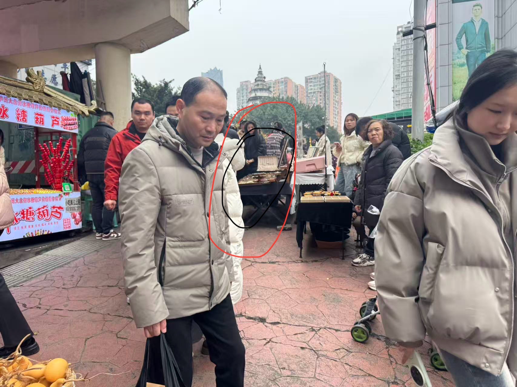 请问这个位置可以摆摊吗,图中红色位置,影响行人,或这个区域允许摆摊吗,是否属于公共区域,是否百姓都可以占用摆摊