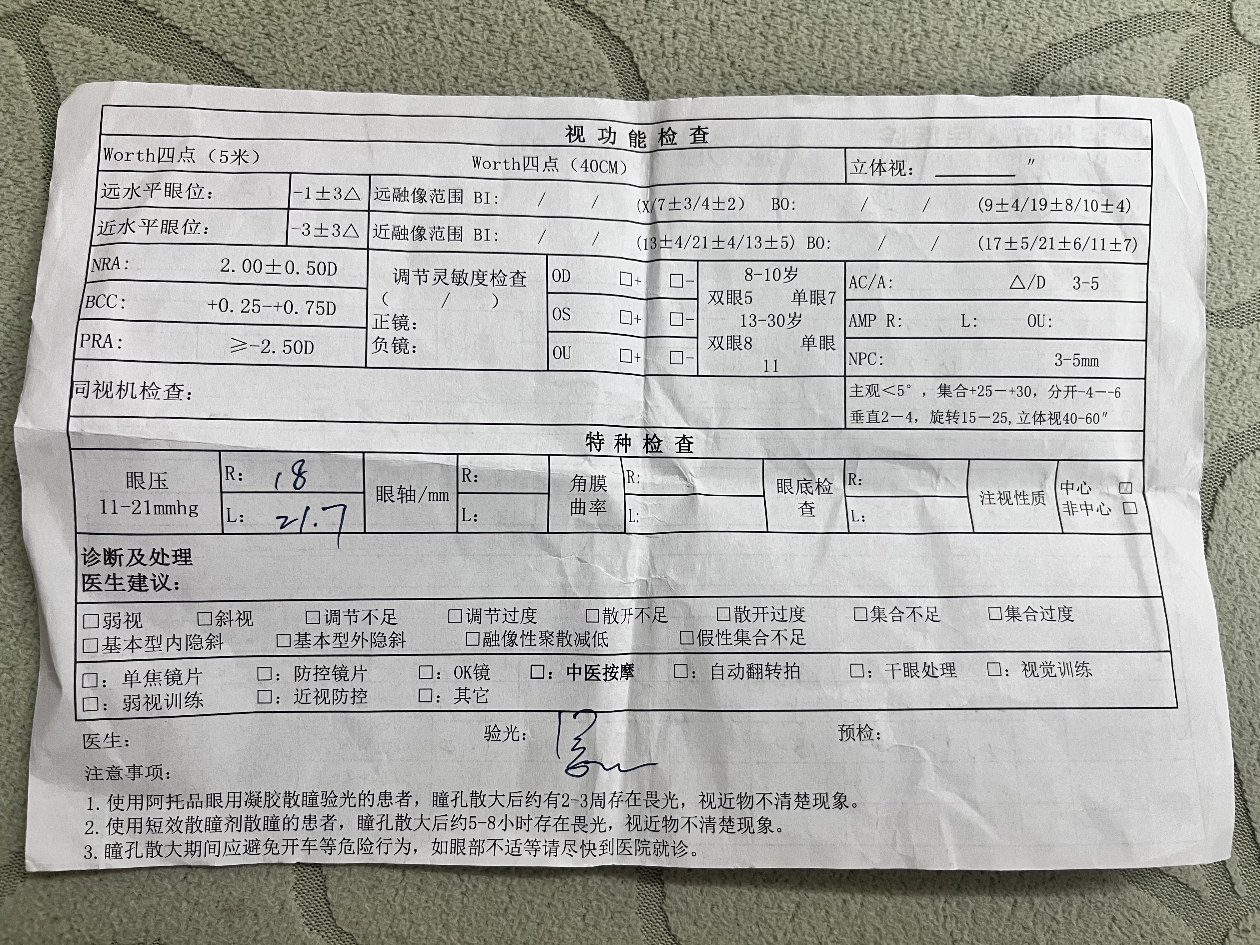 我问了医生,我说检查都做了吗,他说有些没问题就没检查,有些答着其他项一起检查了。并不是钱多钱少问题,是一个视力检查,需要检查那么多项吗?得到的检查单就一个视力检查单,其余的检查结果呢?再说一下这两种眼药水,青少年能用吗?用量多少,停药多久,医生没有交代一点。我严重投诉一下眼科医生,检查未仔细做完,开出的眼药水无根据性,太负责了。